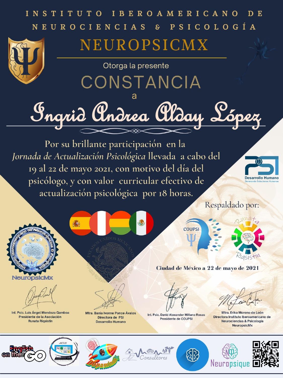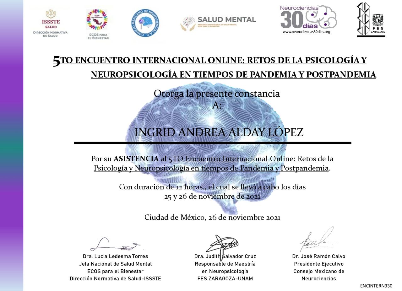 También cuento con experiencia en el área de evaluación Neuropsicologica, en dónde me he especializado en la evaluación y diagnóstico de Trastornos del Neurodesarrollo. Cuento con Diplomados en Fundamentos de Neurofisiología Anatomofuncional, Principios de Neurociencia, Metodología de la investigación, y en Neuropsicología (en curso)