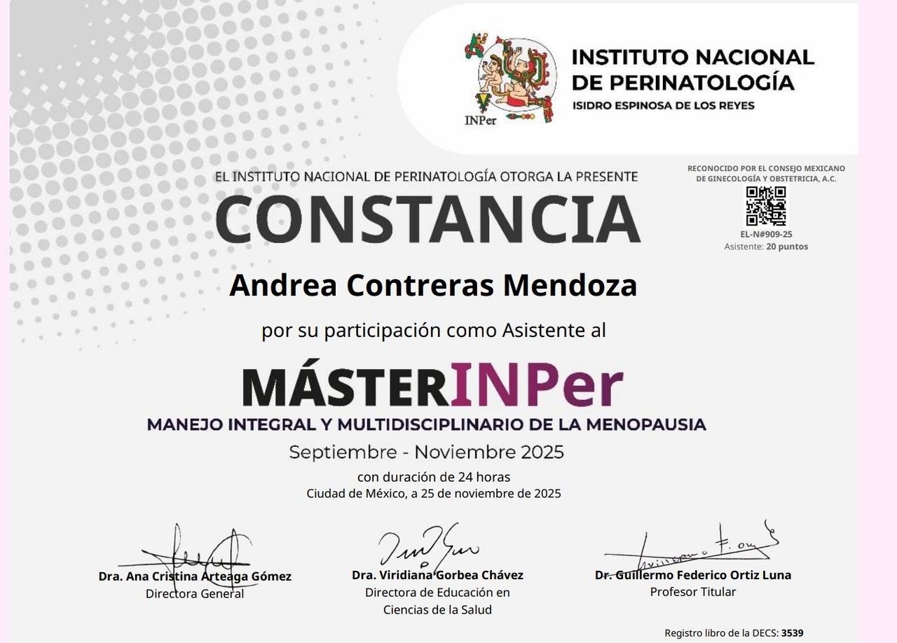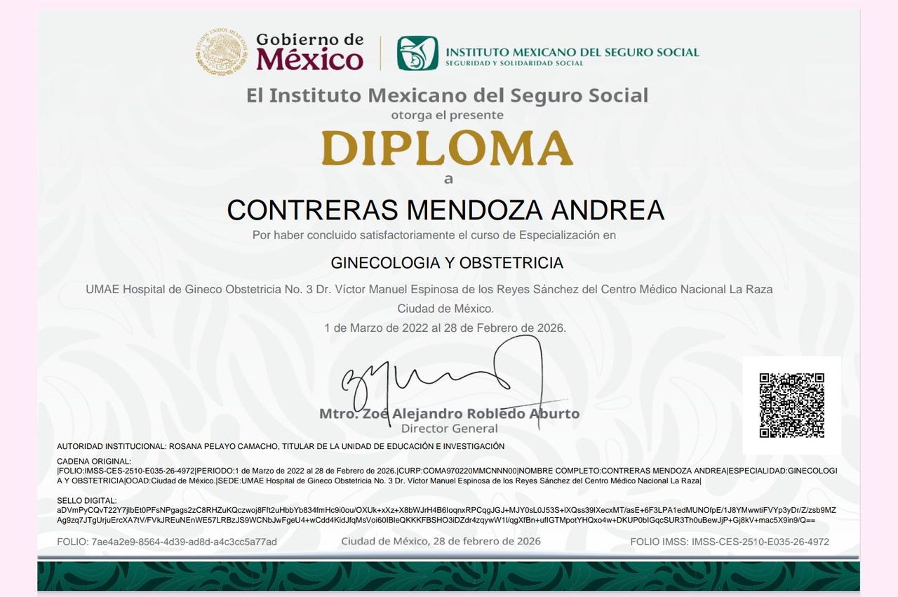 Soy la Dra. Andrea Contreras Mendoza, especialista en Ginecología y Obstetricia, formada en la Universidad Nacional Autónoma de México y en el Hospital de Ginecoobstetricia No. 3 CMN La Raza.