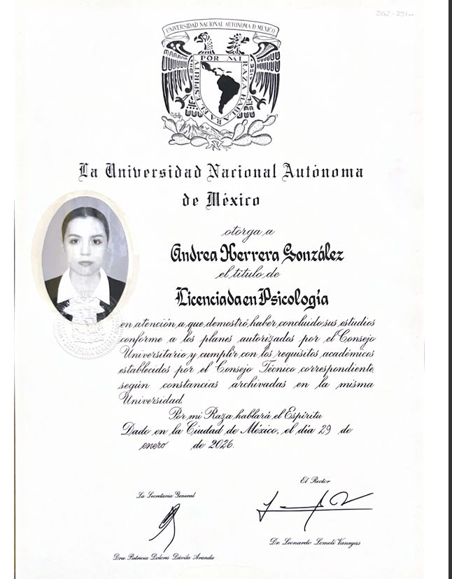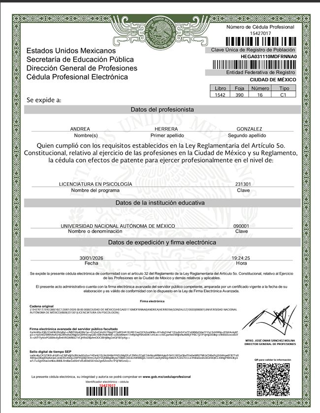 Licenciada en Psicología por la UNAM, con experiencia en el ámbito clínico y en la atención a población infantil, adolescente y adulta, desde el enfoque cognitivo-conductual.