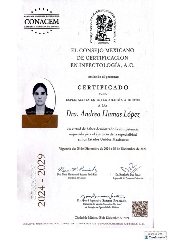 ¡Hola, soy la Dra. Andrea! Soy médica internista e infectóloga. Me formé en el Instituto Nacional de Cancerología y en el Hospital Gea González, y a lo largo de mi carrera he atendido muchos tipos de infecciones: tuberculosis, VIH, infecciones en viajeros, infecciones urinarias , infecciones en piel, entre otras. También estudié en la London School of Hygiene & Tropical Medicine, donde hice una maestría y un diploma en Medicina Tropical que ampliaron muchísimo mi manera de ver la salud y las enfermedades infecciosas.
