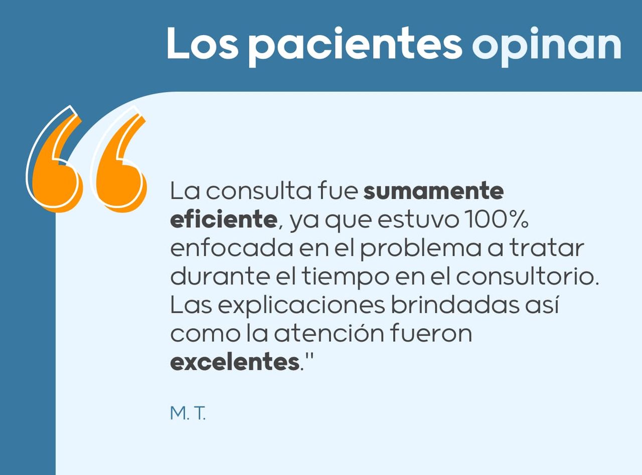 La consulta fue sumamente eficiente, ya que estuvo 100% enfocada en el problema a tratar durante el tiempo en el consultorio. Las explicaciones brindadas así como la atención fueron excelentes.