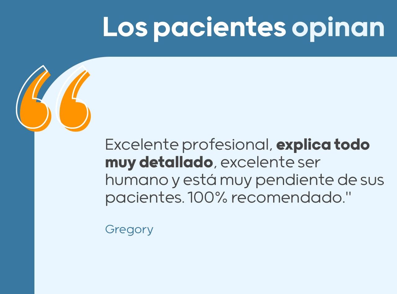 Excelente profesional, explica todo muy detallado, excelente ser humano y está muy pendiente de sus pacientes. 100% recomendado.