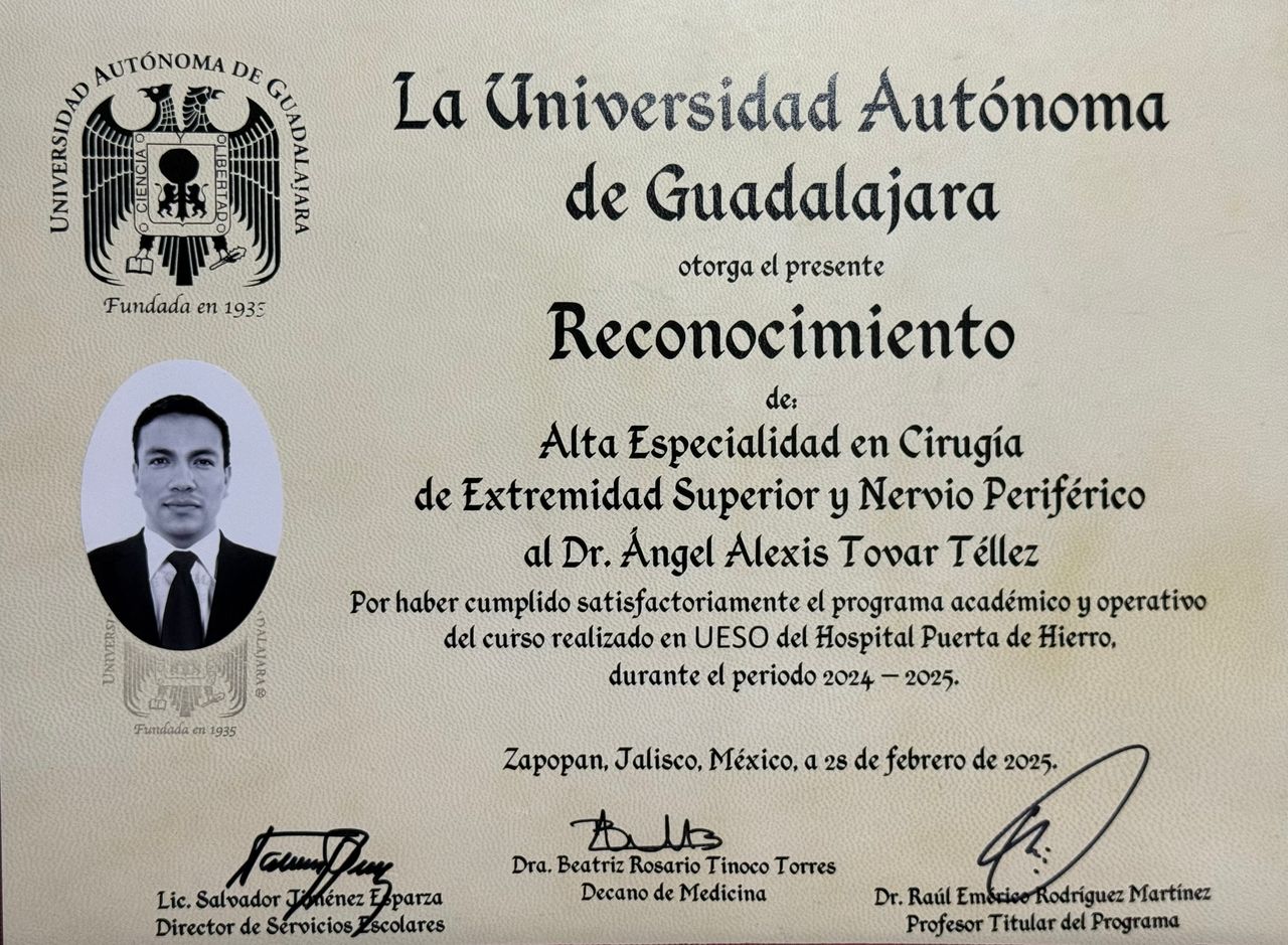 ¡HOLA y Bienvenido! Soy el Dr. Ángel Tovar, Traumatólogo y Ortopedista, cuento con una Alta Especialidad en Cirugía de la Mano, Codo, Hombro y Lesiones de Nervio Periférico, en el Hospital Puerta de Hierro, así como un Diplomado en Cirugía de Nervio Periférico y Plexo Braquial en la Clínica Mielina del Hospital Real San José Lázaro Cárdenas ambos Avalados por la Universidad Autónoma de Guadalajara.