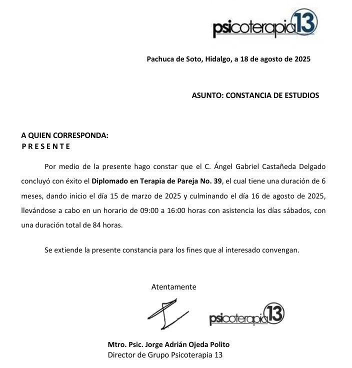 Además, cuento con un diplomado en hipnosis clínica, que me brinda recursos adicionales para el consultorio, y un diplomado en terapia de pareja que tomé en este 2025, que refuerza mi experiencia en el acompañamiento de vínculos amorosos desde el enfoque de la psicoterapia sistémica estructural.