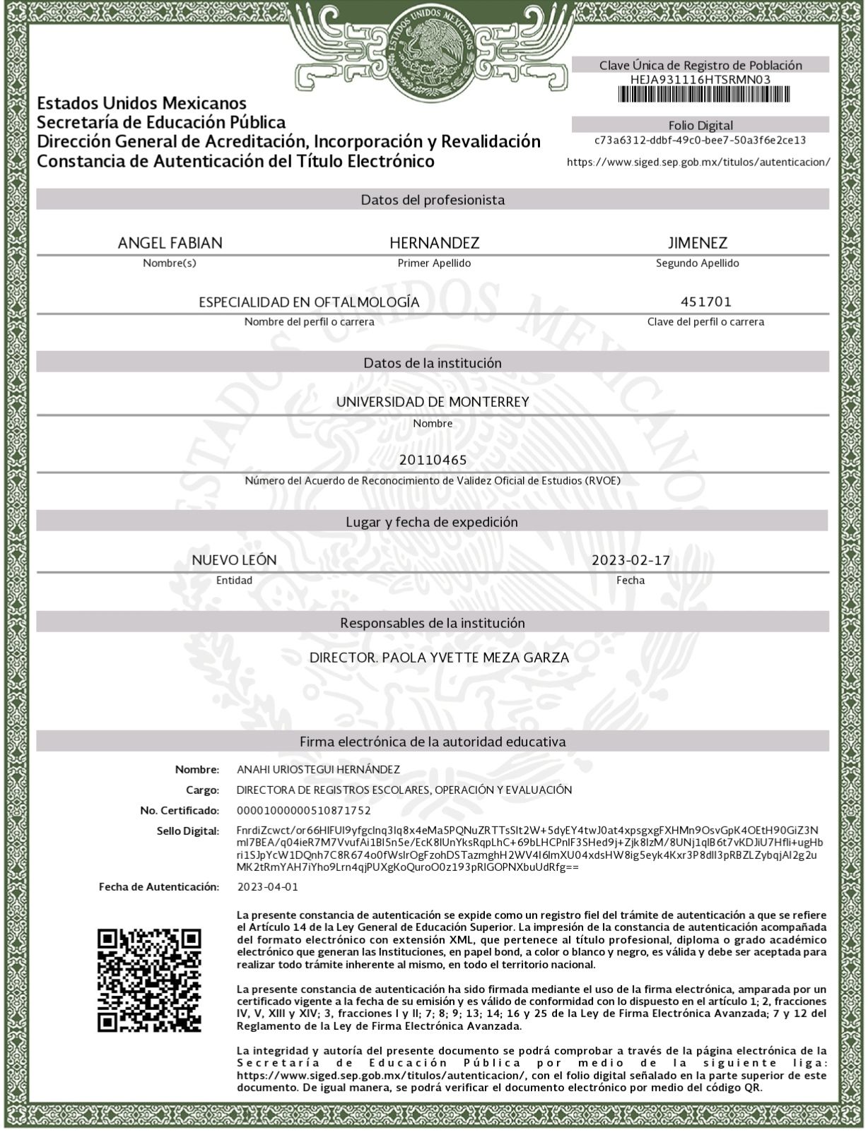Especialidad en Oftalmología: Realizada en la Unidad Médica de Alta Especialidad (UMAE) en Monterrey, Nuevo León, uno de los centros de salud visual más importantes de México.