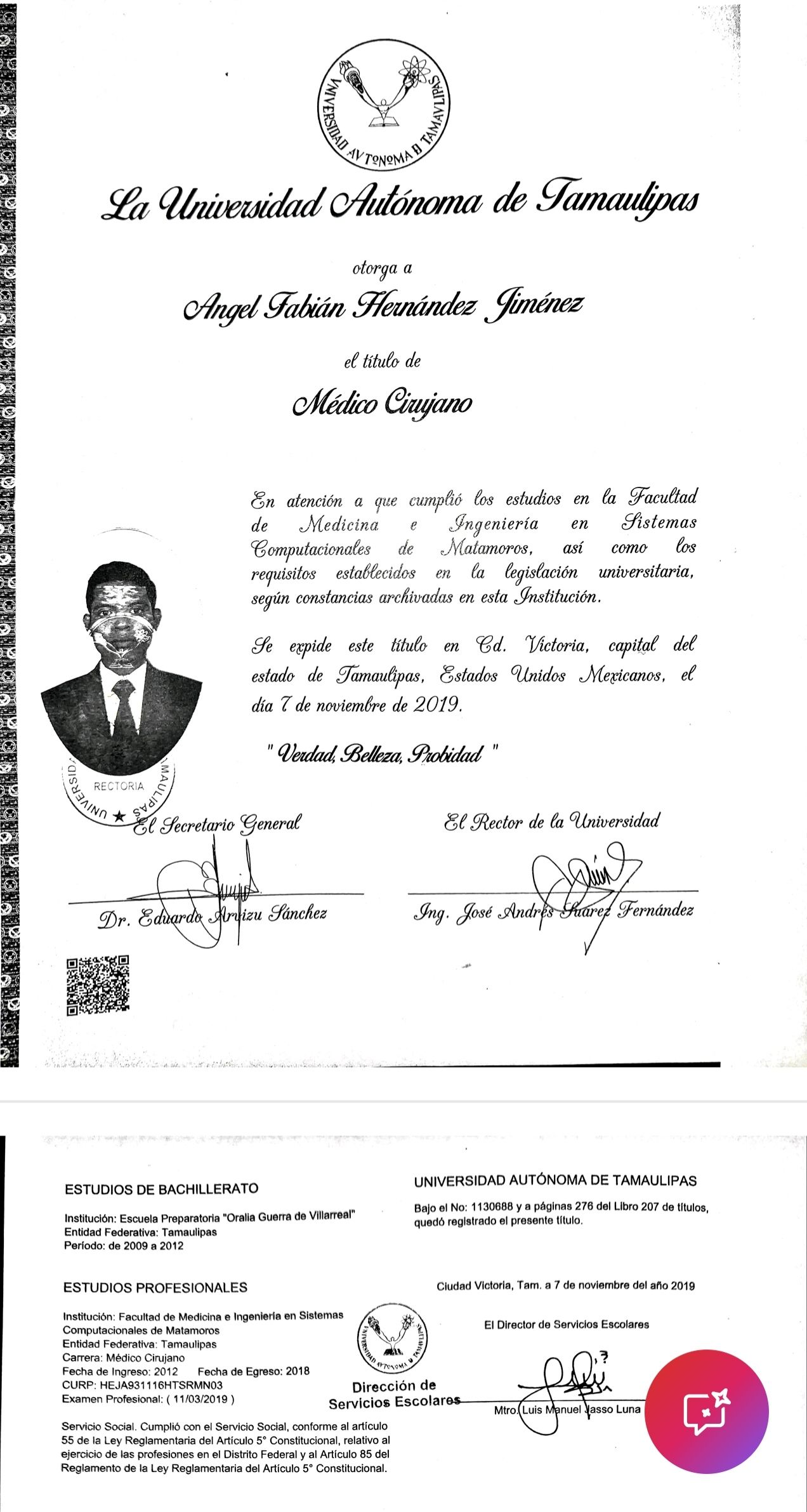 Médico Cirujano: Egresado de la Universidad Autónoma de Tamaulipas (UAT) en la Facultad de Medicina e Ingeniería en Sistemas Computacionales.