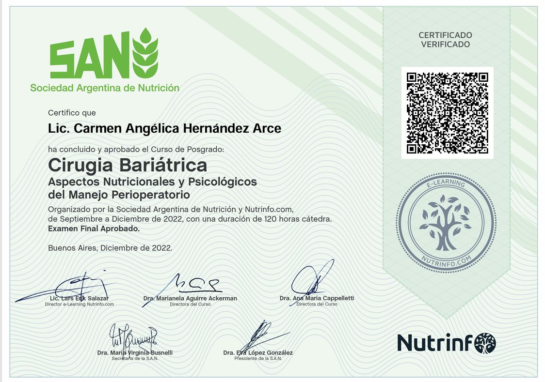 Nutrióloga certificada, especialista en nutrición clínica y bariátrica