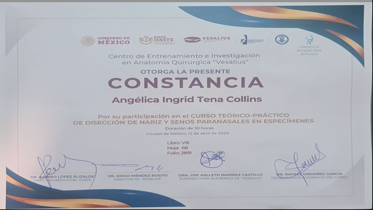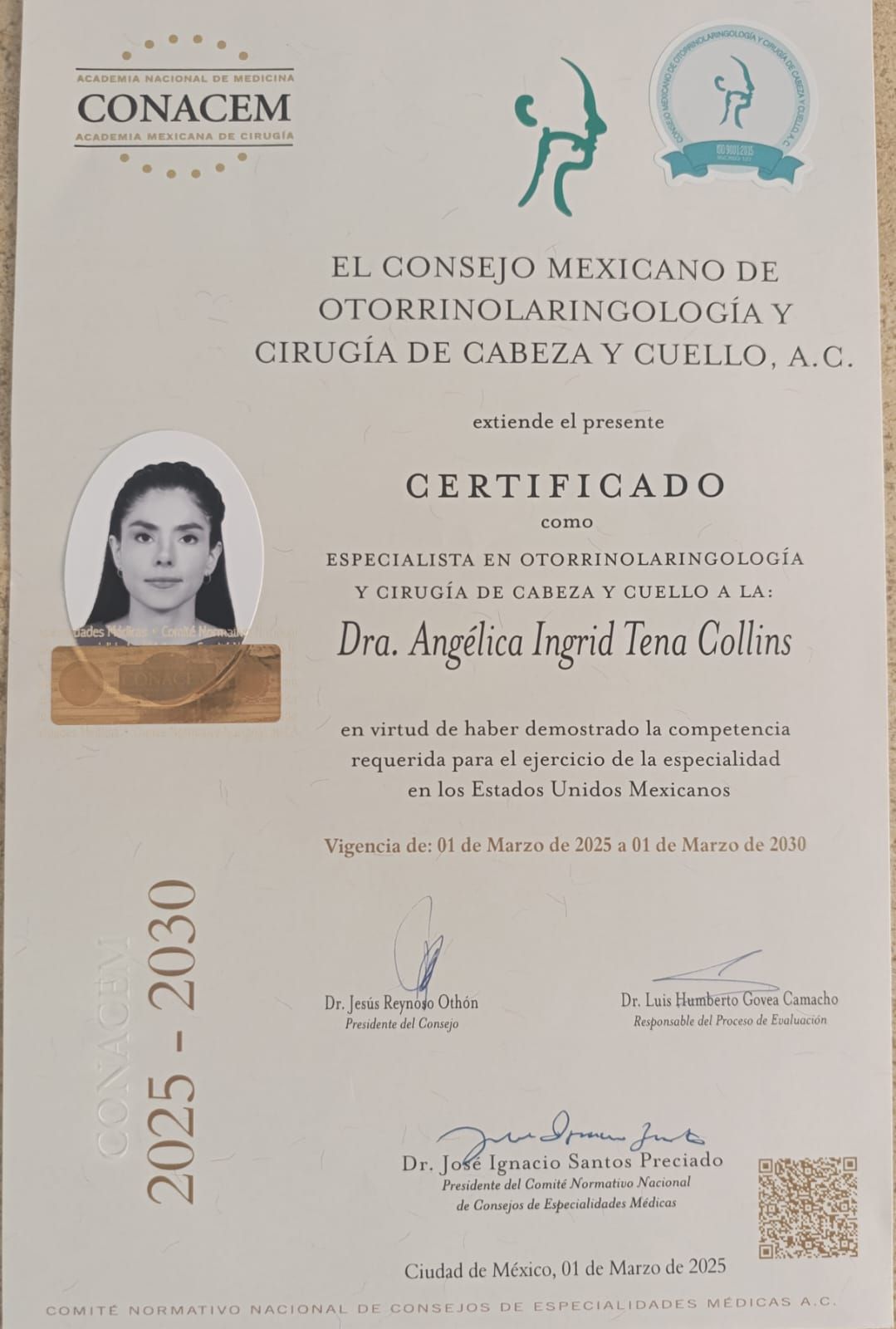 Certificada por el Consejo Mexicano de Otorrinolaringología y Cirugía de Cabeza y Cuello (TEC 3612/25)
