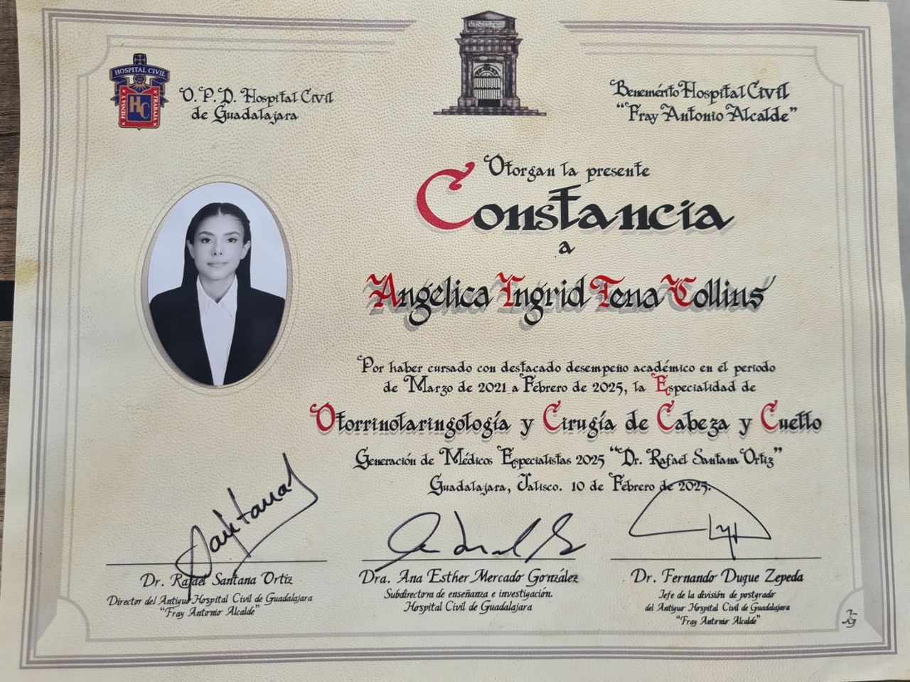 Realicé mis estudios como médico general en la Universidad Cristóbal Colón y como especialista en el Hospital Civil de Guadalajara "Fray Antonio Alcalde".