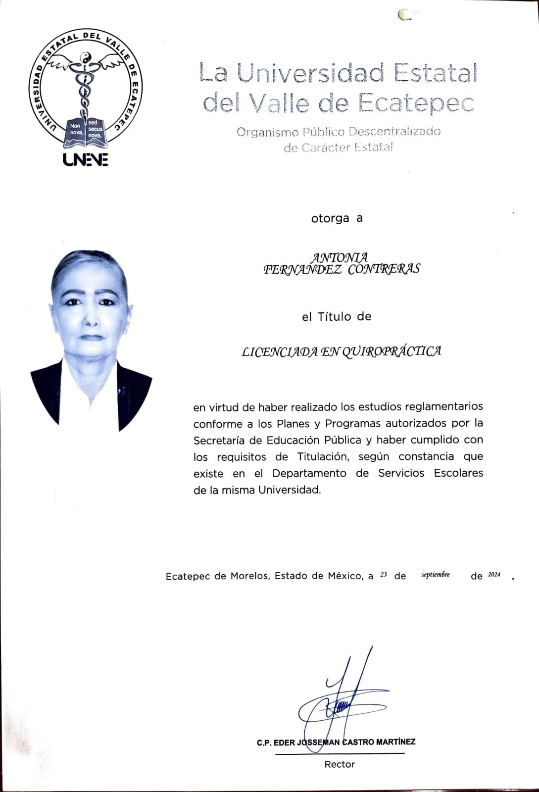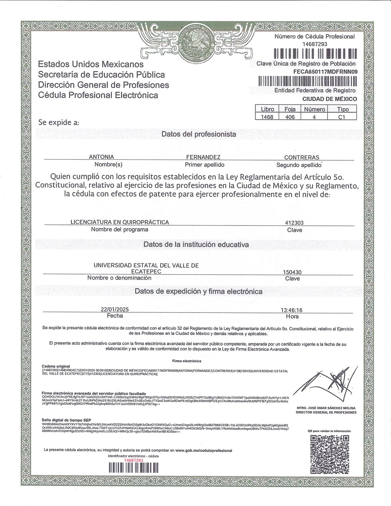 Llevé a mi esposa por malestares en ciertas cervicales por ejercicios, lo cual la Lic Antonia nos explicó todo detalladamente para llevar a cabo su ajuste corporal y la verdad hubo una mejoría muy importante porque dejó de sentir los dolores y le hizo un ajuste completo