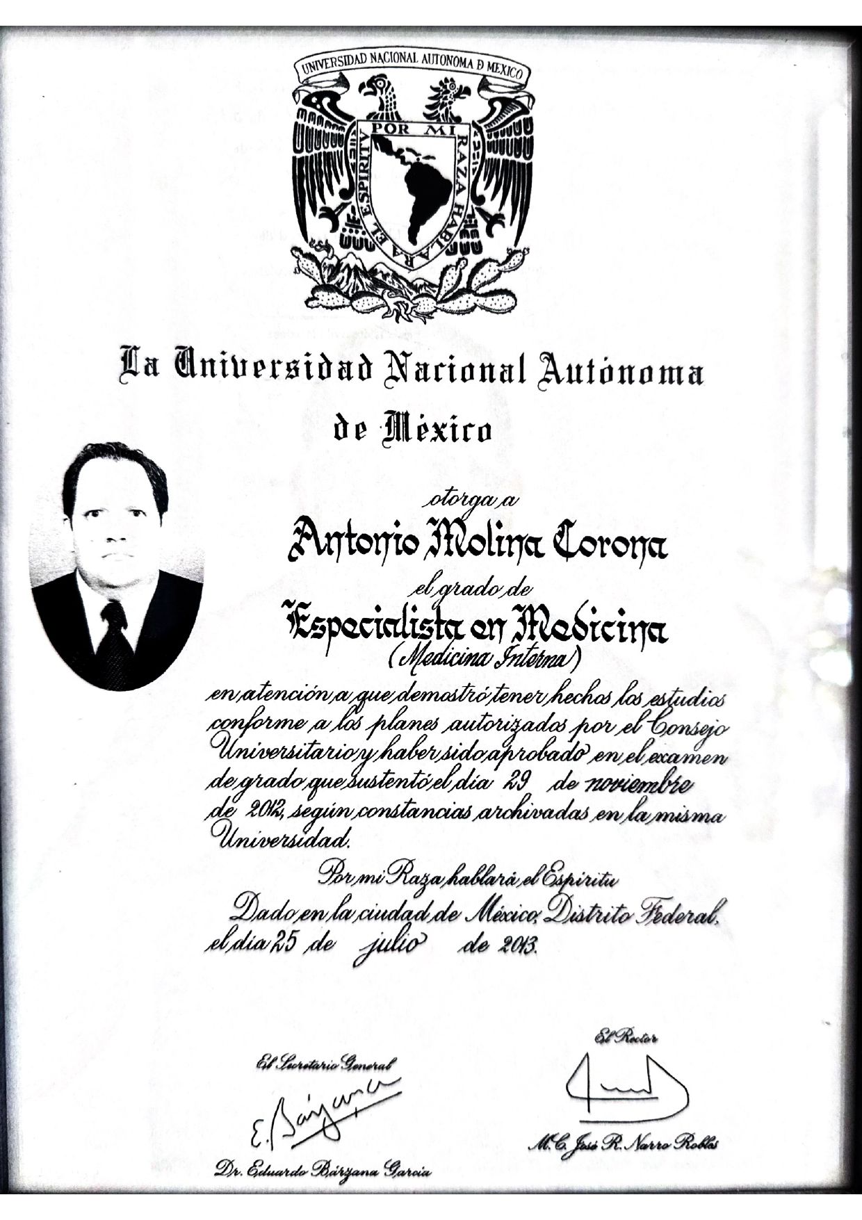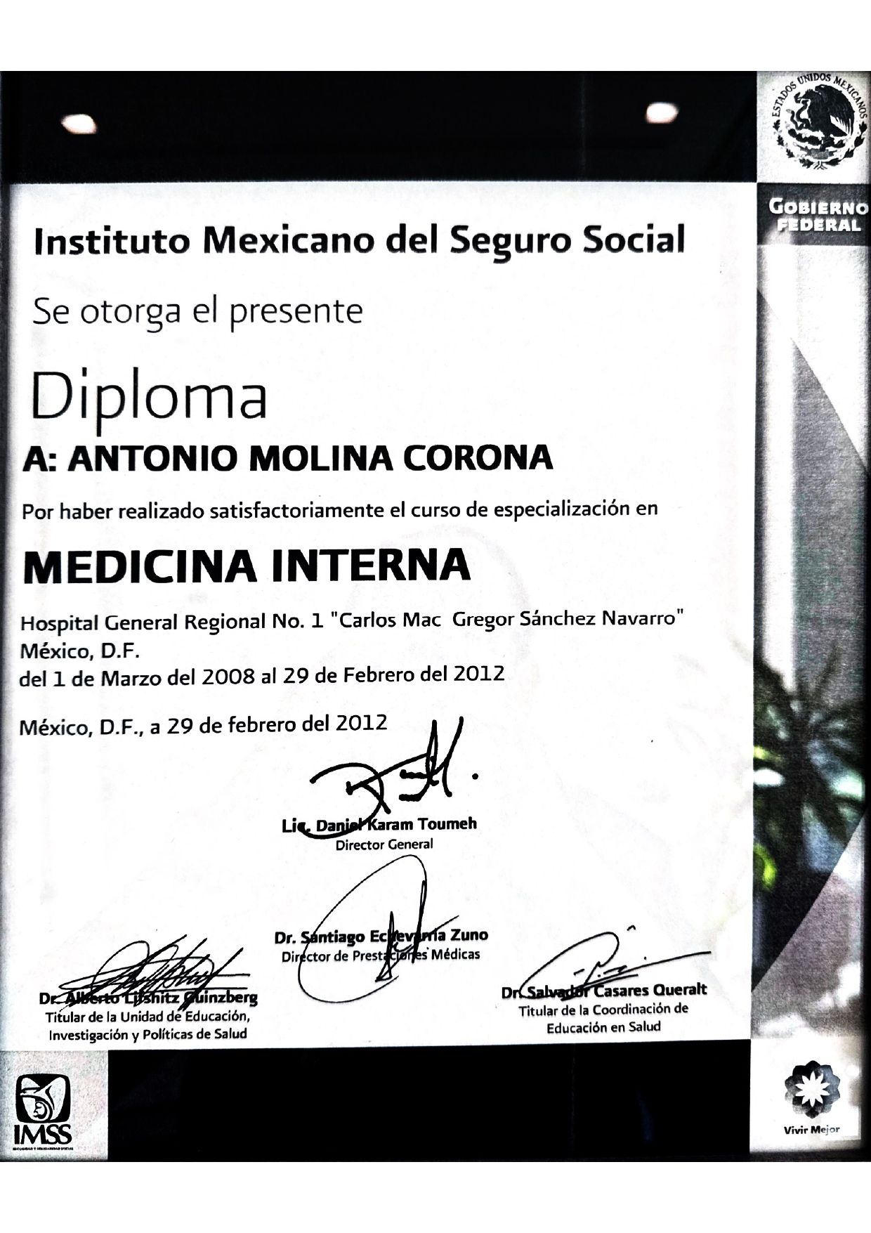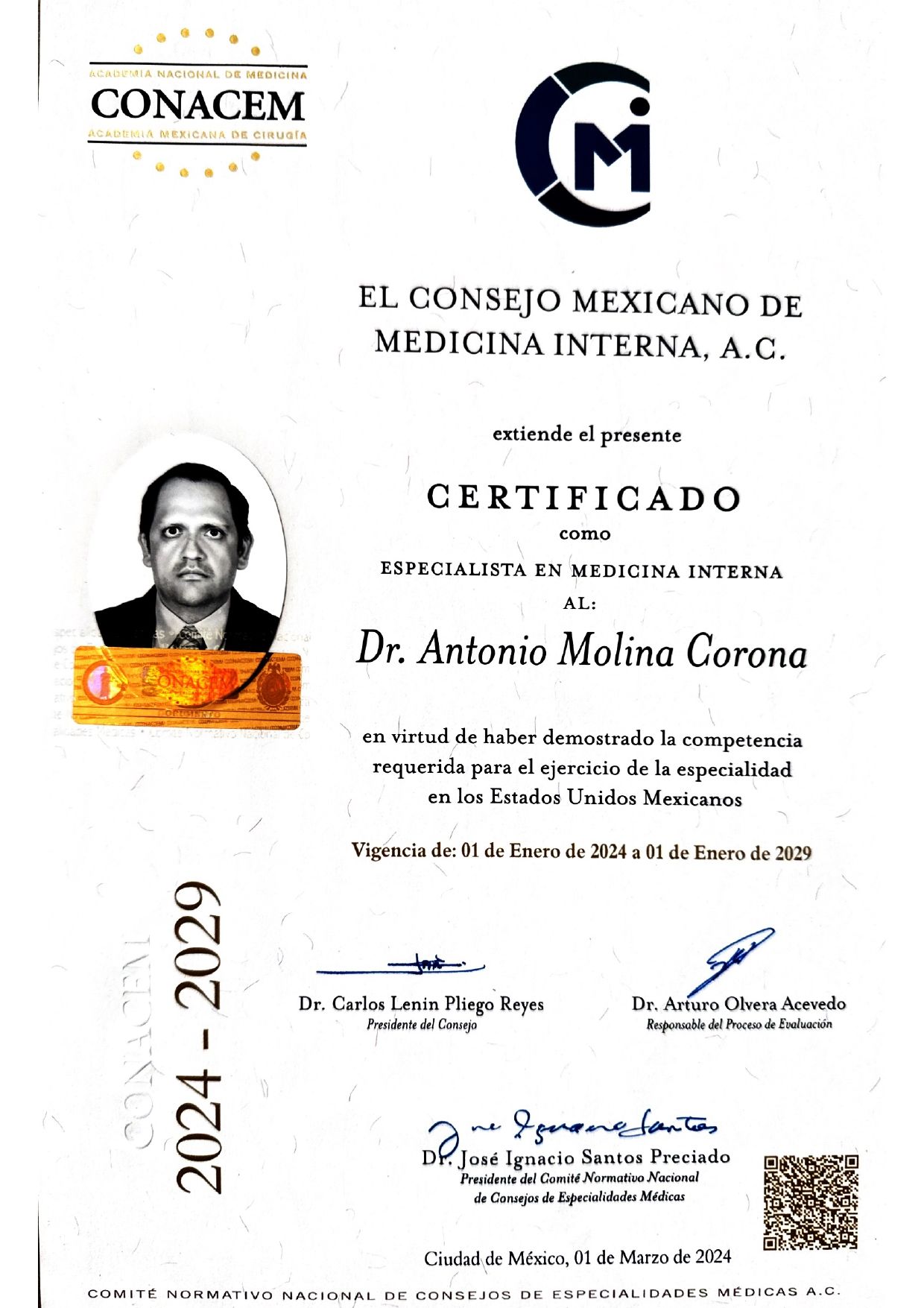 Soy el Dr. Antonio Molina Corona, médico especialista en Medicina Interna con más de 13 años de experiencia. He trabajado en el IMSS y formo parte del staff médico del Hospital del Prado desde hace 11 años, brindando atención integral a pacientes con diferentes condiciones clínicas.