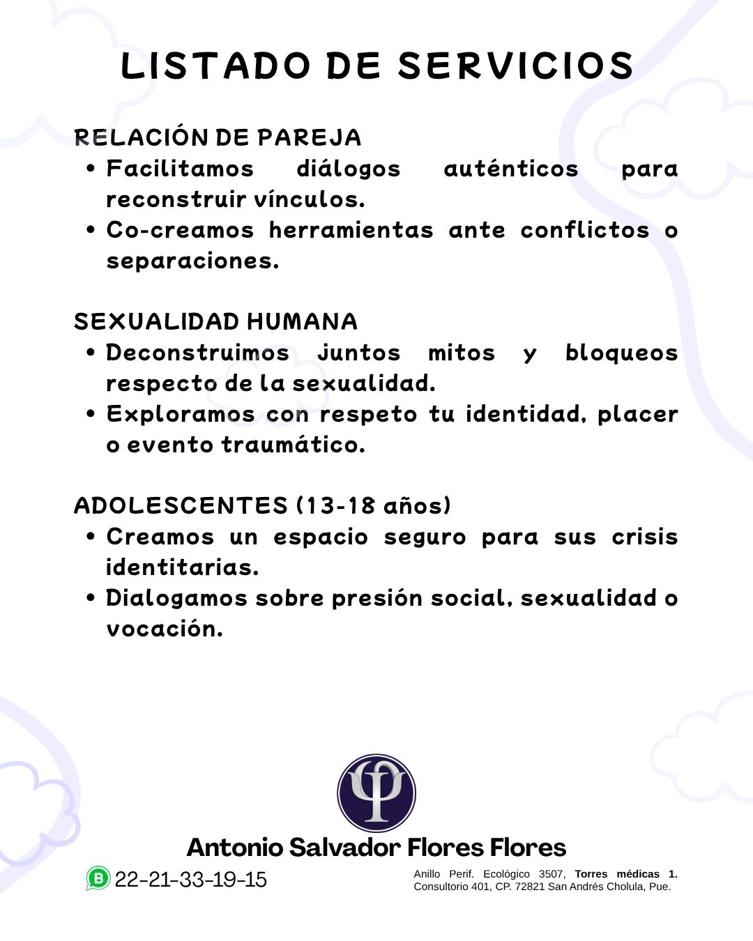 Soy Antonio Salvador Flores Flores, originario del estado de Puebla | Psicoterapeuta especialista en estados de ánimo, sexualidad y pareja.