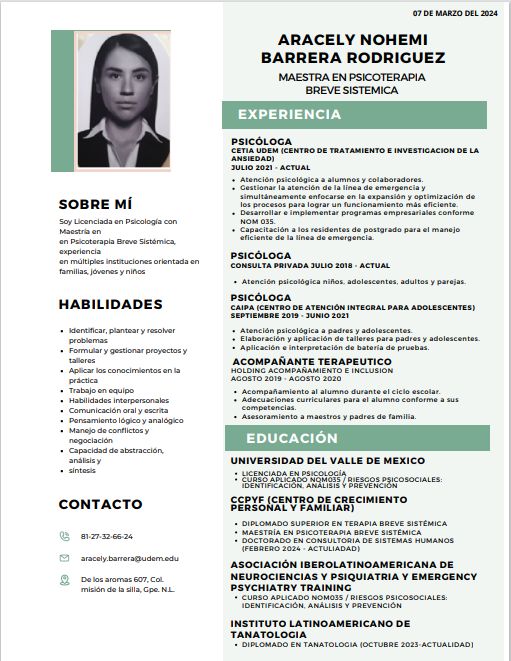 Estoy más que encantada con la terapia que he recibido durante 2, casi 3 años con la Psicóloga Aracely, me ha ayudado bastante a conocerme a mi misma, a aceptarme y entender cada uno de mis sentimientos, a aprender a sobrellevarlos y poder comunicarme de una mejor manera con las personas a mi alrededor. Siempre se ha mostrado muy conciente de cada cosa que le platico, muy empática y sobre todo muy acertada en sus consejos o análisis. Realmente fue un alivio haber encontrado el apoyo que tanto necesitaba en cada una de nuestras sesiones, desde el día 1 supe que estaba tomando la decisión correcta al priorizar mi salud mental e ir de la mano con la Psicóloga Aracely, creo que nunca terminaría de agradecerle por todo lo que ha hecho por mi.