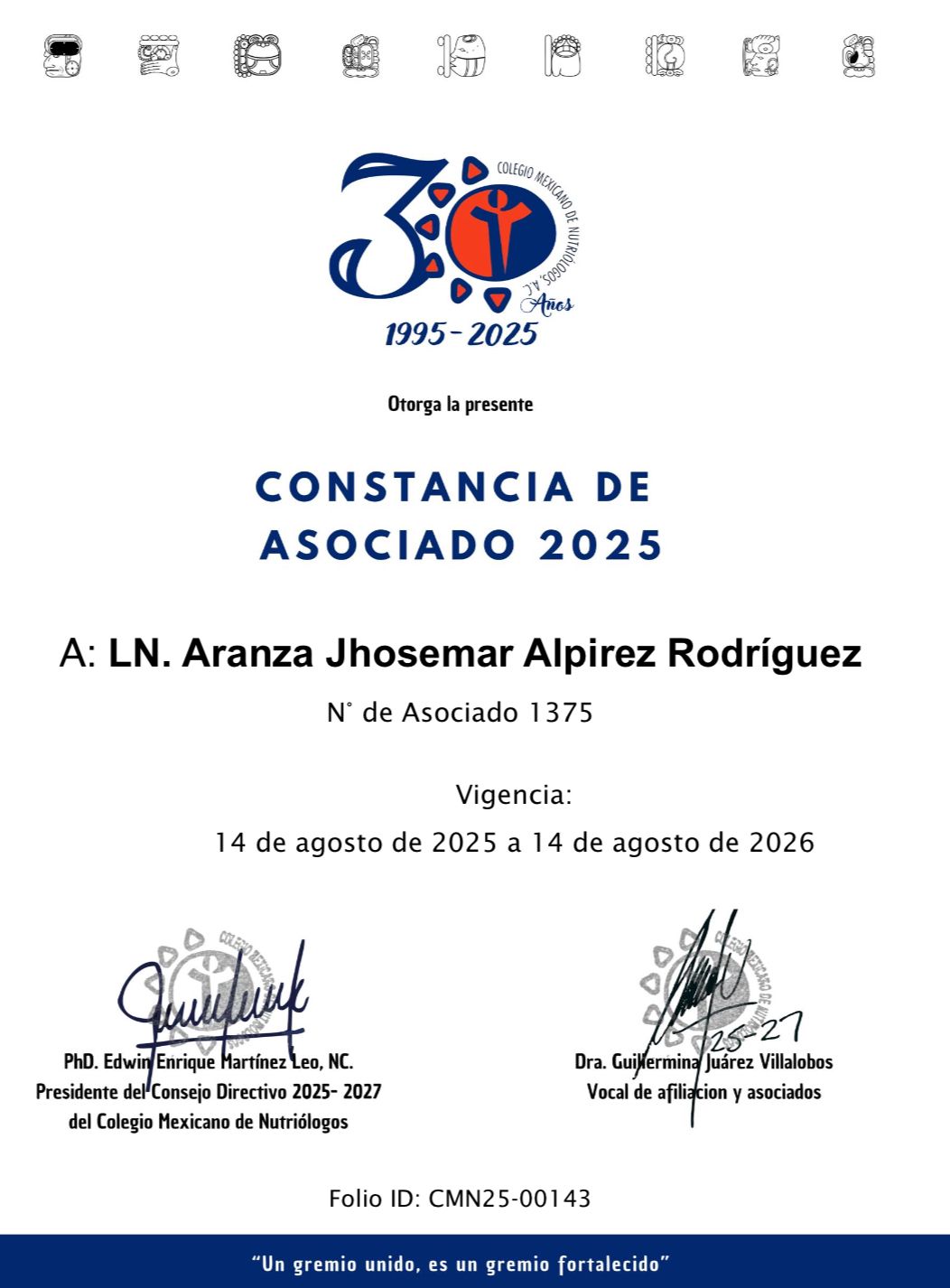 Estoy afiliada al Colegio Mexicano de Nutriólogos, lo que respalda mi ejercicio profesional. Mi enfoque es 100% personalizado: adapto los planes a tu estilo de vida, metas y posibilidades, buscando siempre cambios sostenibles y que disfrutes el proceso.