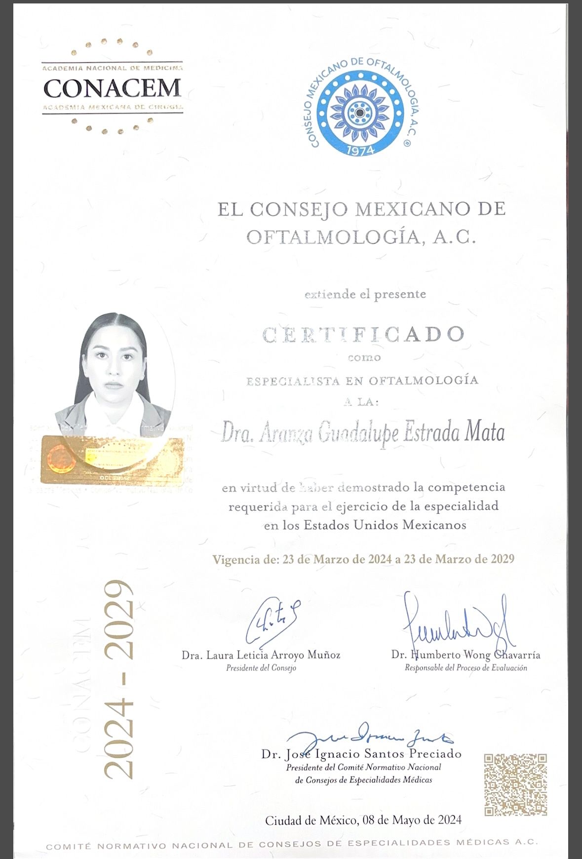 Estoy certificada por el Consejo Mexicano de Oftalmología y soy miembro de la Sociedad Mexicana de Oftalmología, así como del Centro Mexicano de Córnea y Cirugía Refractiva.
