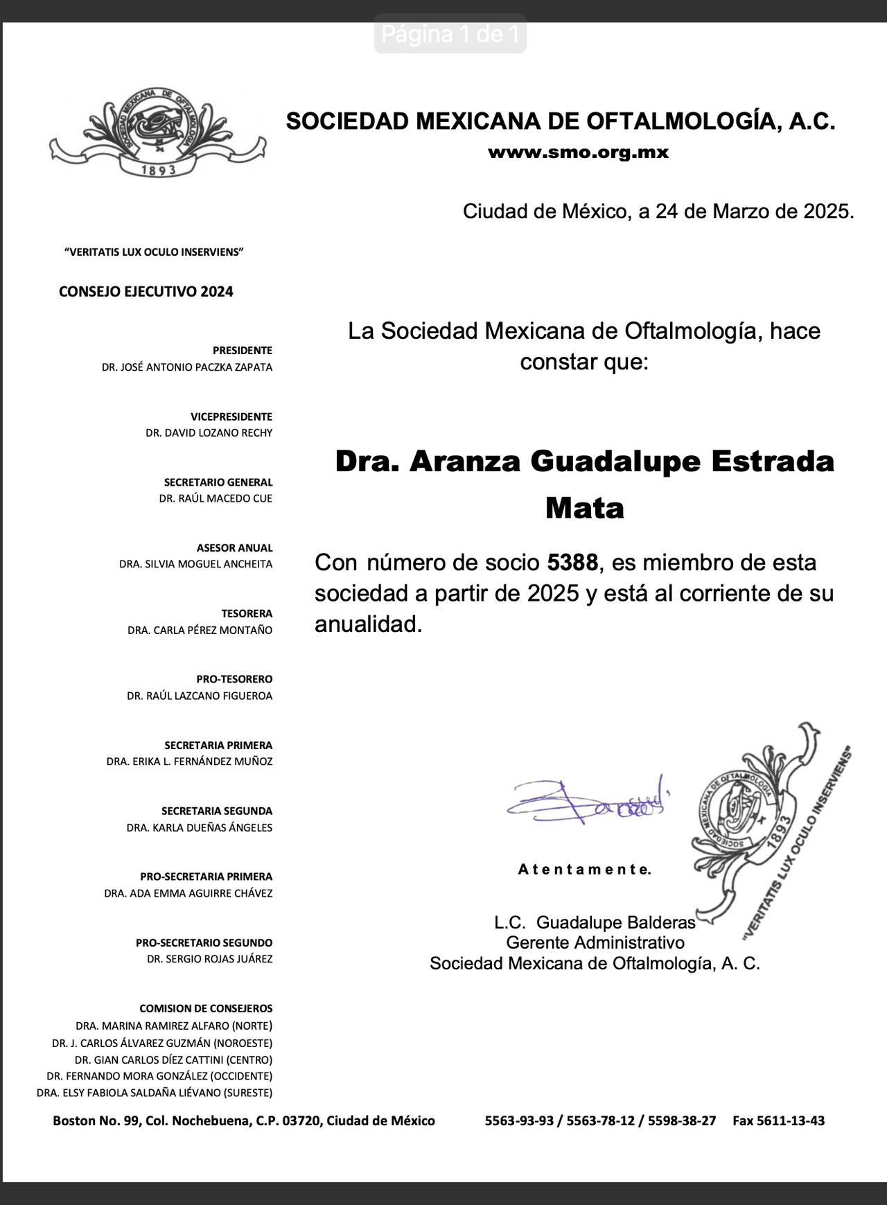 Hola, soy la Dra. Aranza Estrada Mata, oftalmóloga. Me formé como Médico Cirujano en la UNAM y realicé la especialidad en la Asociación para Evitar la Ceguera en México, donde también concluí la alta especialidad en Córnea y Cirugía Refractiva. Actualmente soy médico adscrito al Servicio de Córnea y Cirugía Refractiva de esta misma institución.