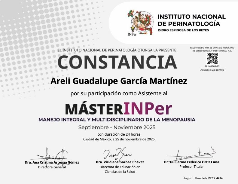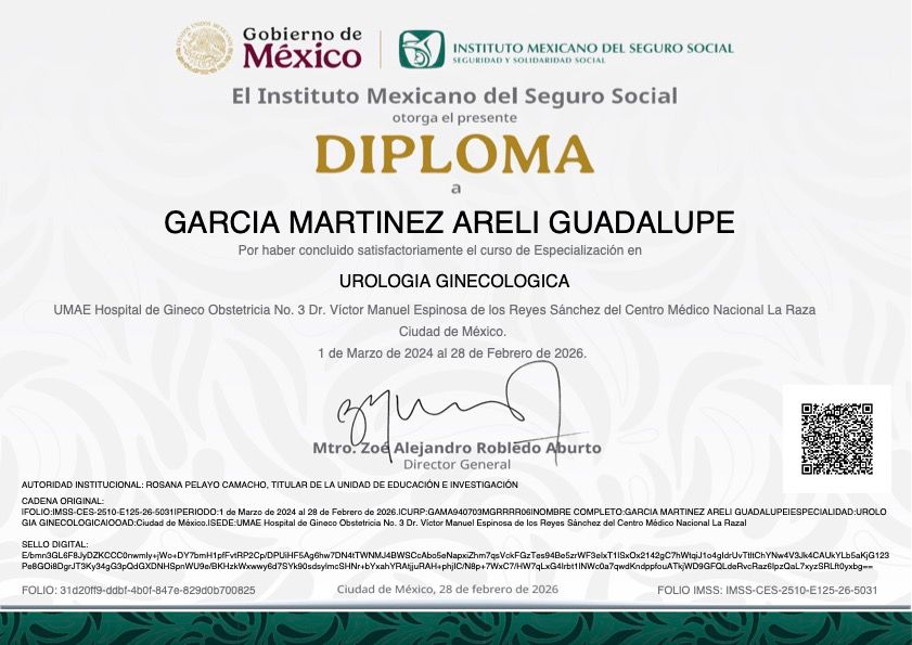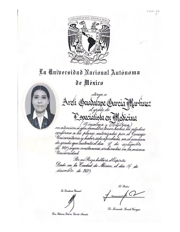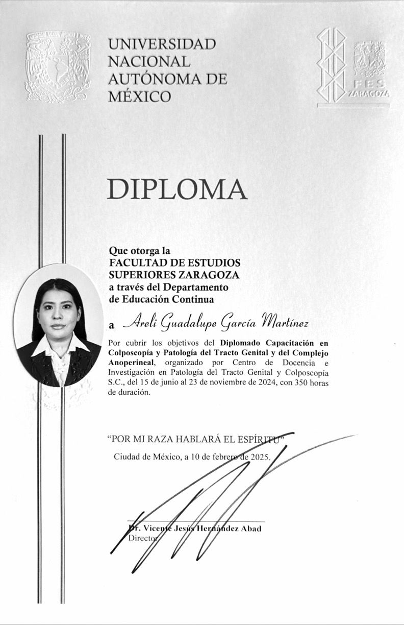Soy médica especialista en Ginecología y Obstetricia y subespecialista en Urología Ginecológica, egresada de la Universidad Nacional Autónoma de México (UNAM). Cuento además con un Diplomado en Colposcopía y Patología del Tracto Genital y del Complejo Anoperineal Inferior, un Máster en Manejo Integral y Multidisciplinario de la Menopausia, y actualmente curso un Diplomado en Ginecología Endocrina.