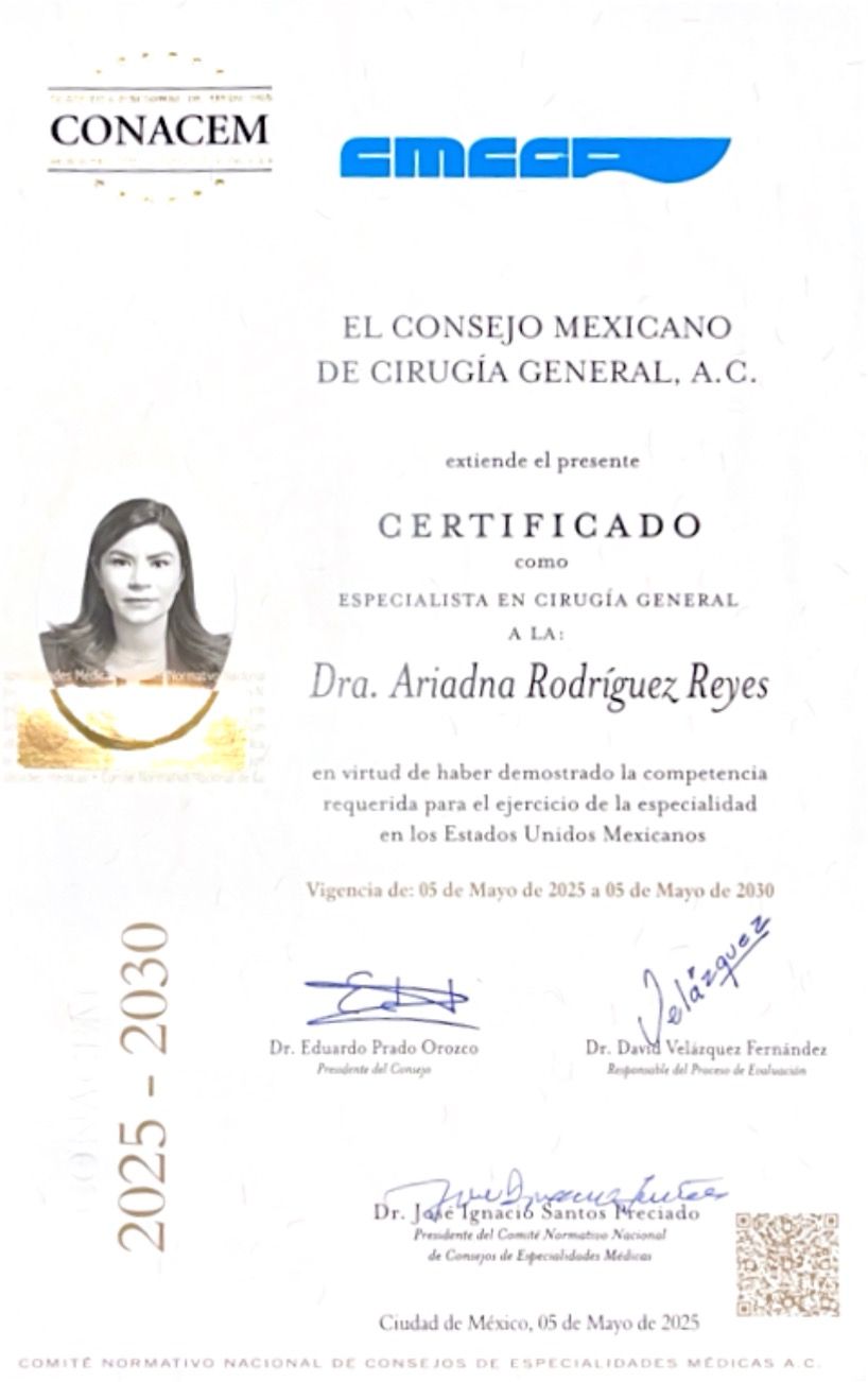 Soy especialista en Cirugía General, certificada por el Consejo Mexicano de Cirugía General, egresada de la Unidad Médica de Alta Especialidad en Puebla, con Maestría en Ciencias Médicas e Investigación. Mi formación inició en la Benemérita Universidad Autónoma de Puebla, donde obtuve el título de Médico Cirujano y Partero.