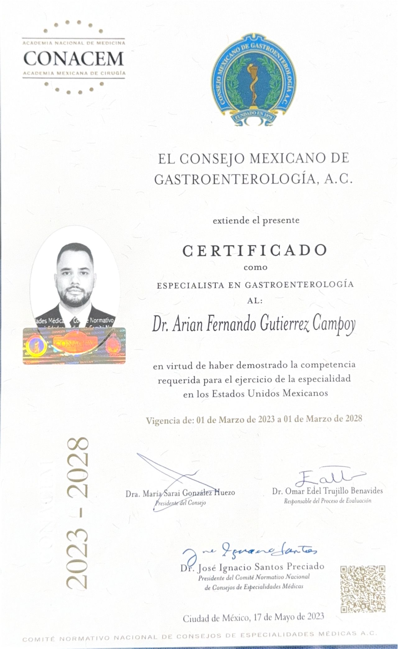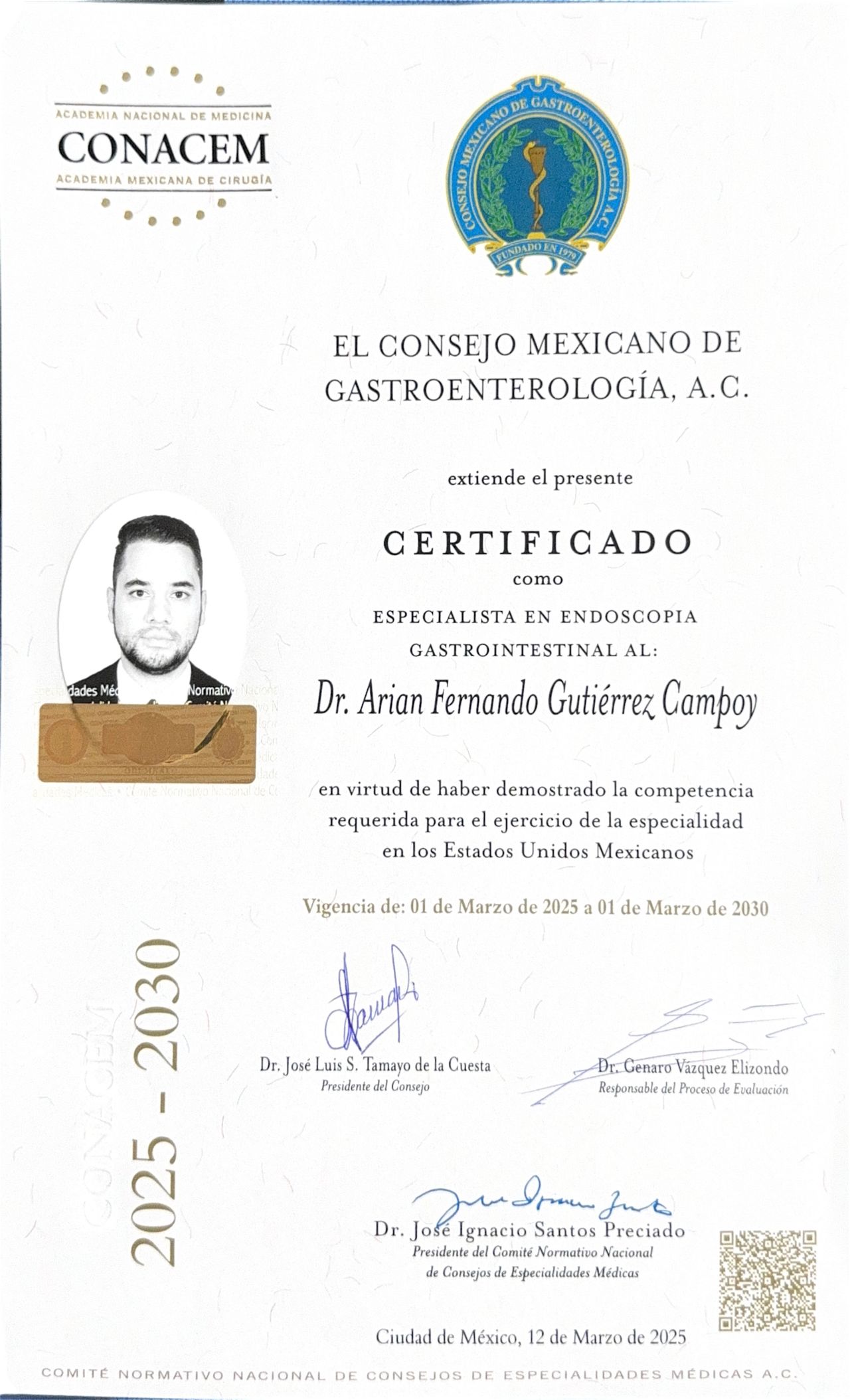 ¡Hola! Soy el Dr. Arián Gutiérrez Campoy, médico especialista en Gastroenterología con alta especialidad en Endoscopia Gastrointestinal.
