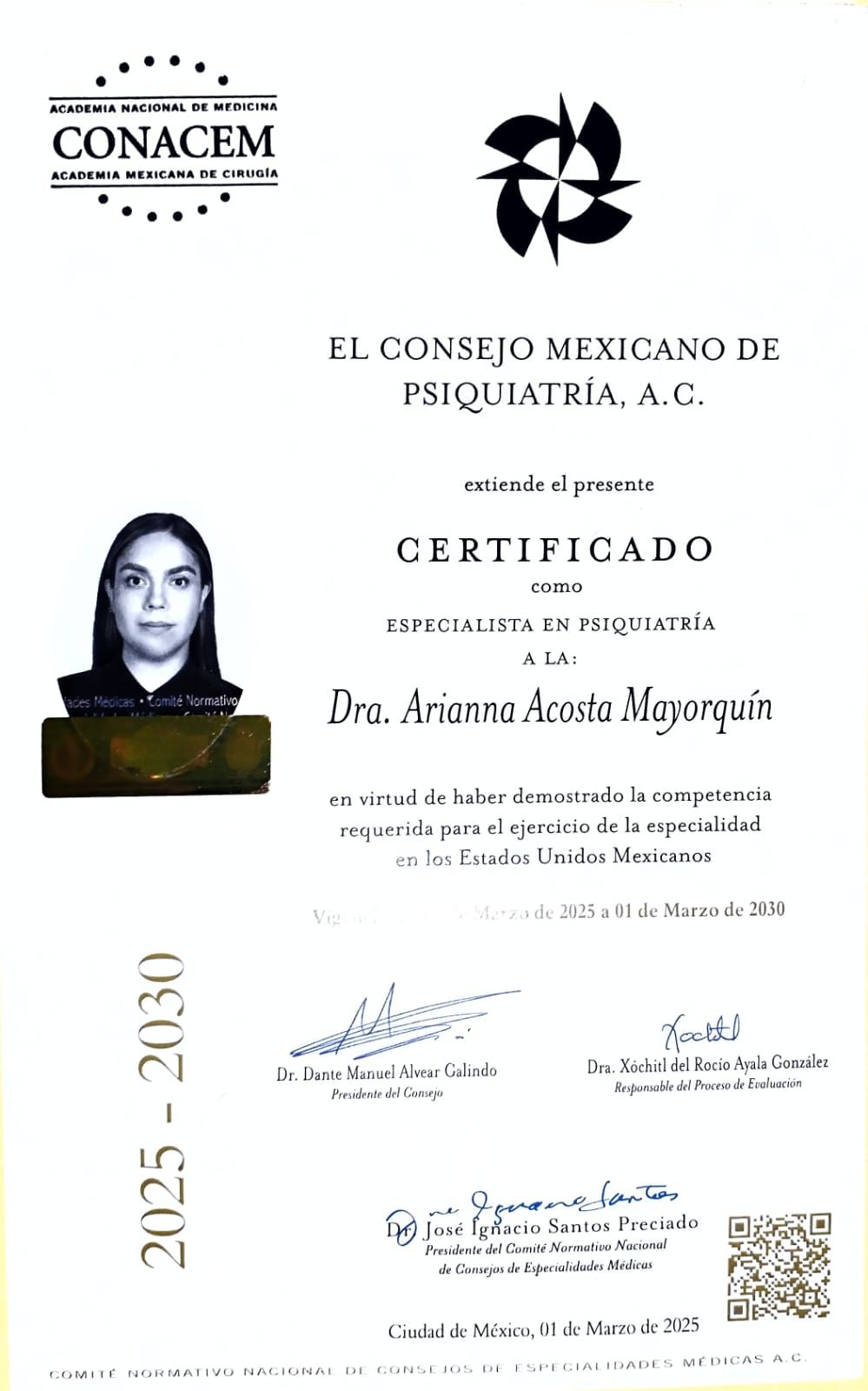 Quiero recomendar a la Dra. Arianna Llegué a su consulta en un momento muy difícil, con mucha ansiedad y sintiéndome sin dirección, desde el principio me hizo sentir totalmente segura y escuchada. Me explicó mi plan de tratamiento de forma tan clara y sencilla que me sentí en control de mi proceso.Gracias a su ayuda, he recuperado la calidad de vida y tengo las herramientas necesarias para gestionar mis emociones, es una psiquiatra profesional, atenta y empática muchas gracias por su increíble trabajo.