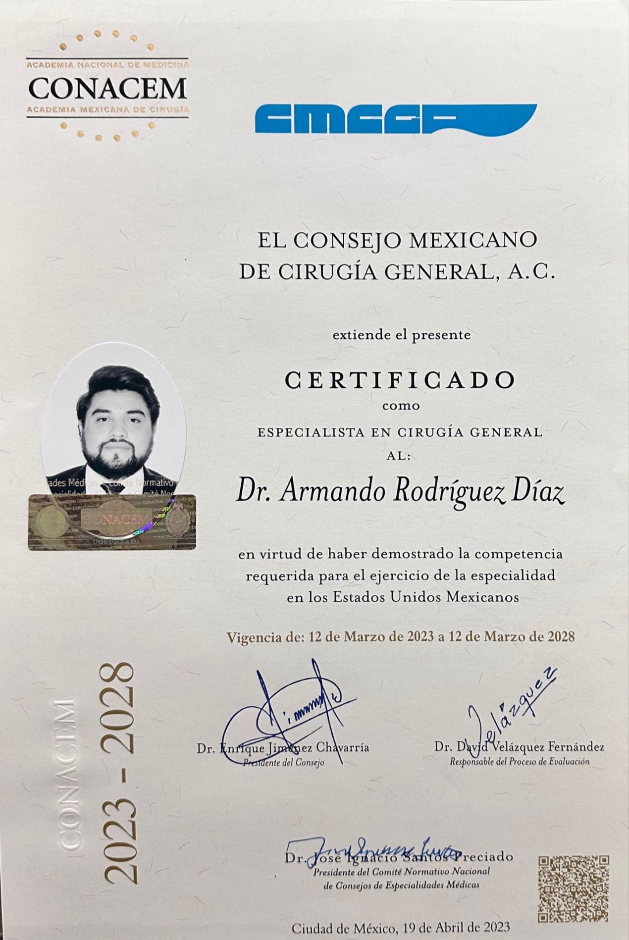 Certificado por el Consejo Mexicano de Cirugia General y miembro de la Asociación Mexicana de Cirugia General AMCG y de la Asociación Mexicana de Cirugia Endoscopica AMCE