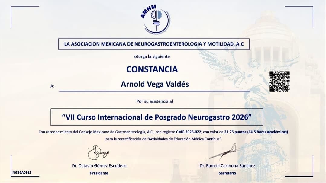 Soy el Dr. Arnold, Médico Cirujano egresado de la UAEM con especialidad en Gastroenterología por la UNAM, realizada en el Hospital General de México “Dr. Eduardo Liceaga”. Cuento con más de 8 años de experiencia en el ámbito médico, tanto en instituciones públicas como en la práctica privada.
