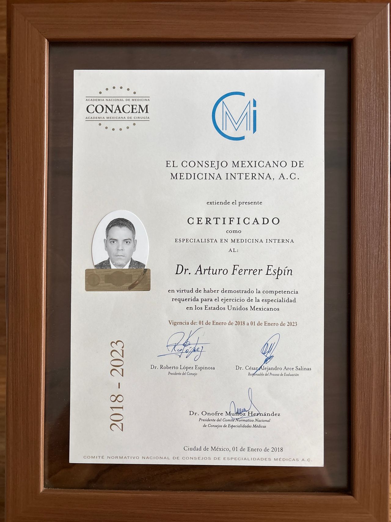 Certificación vigente por el Consejo Mexicano de Medicina Interna (2018-2023).