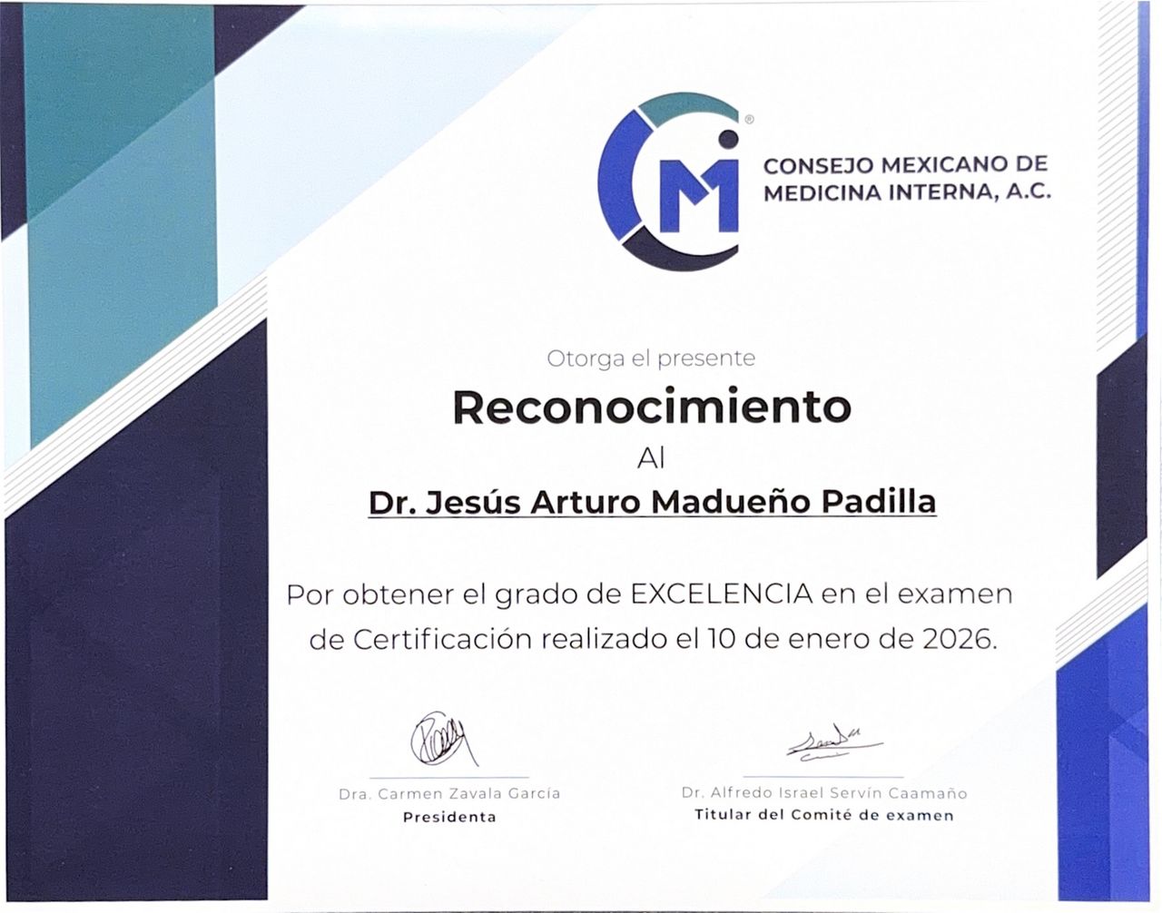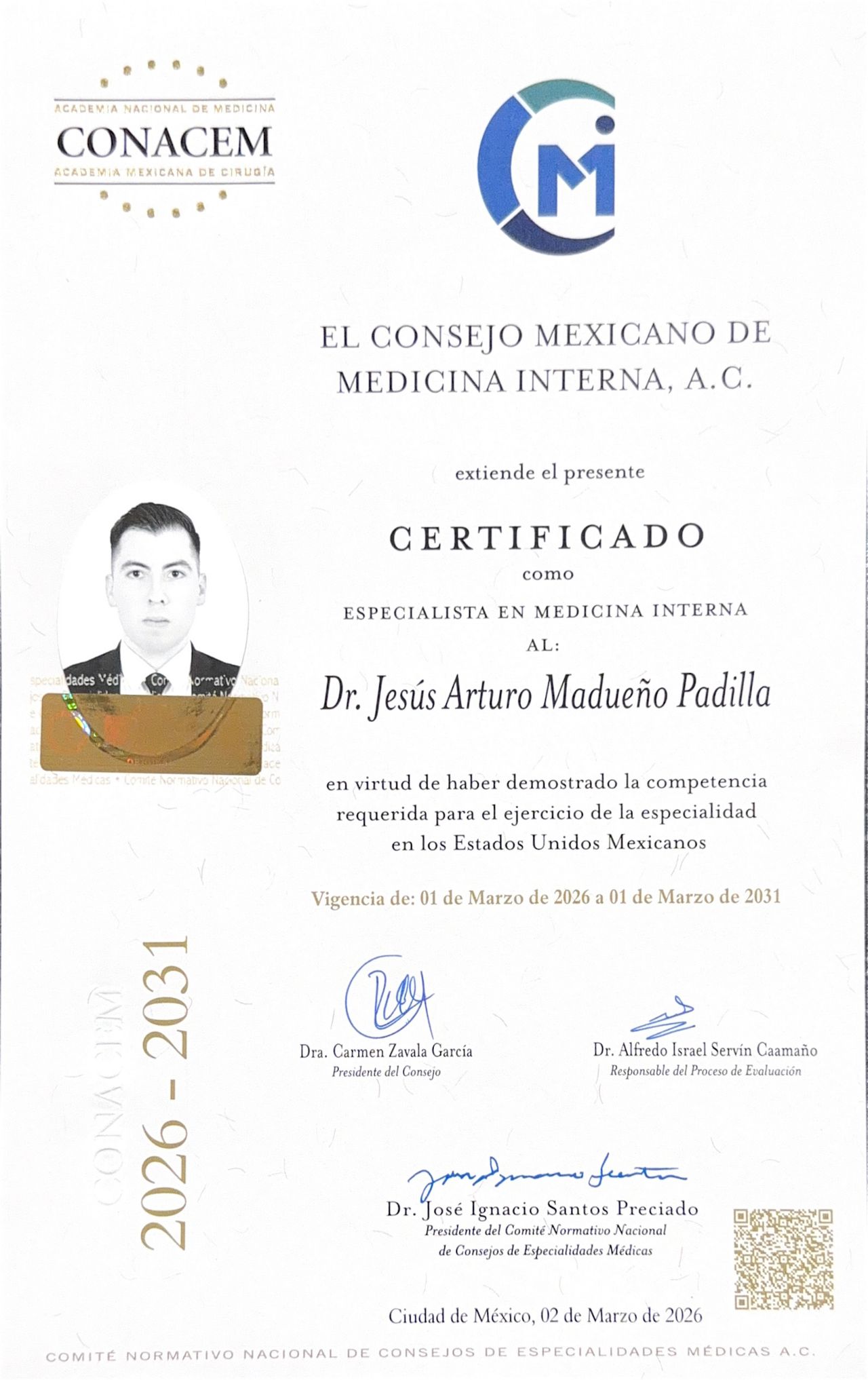 ¡Saludos! Soy el Dr. Arturo Madueño, Médico Internista y Educador en Diabetes, egresado del Hospital de Especialidades Centro Médico Nacional La Raza, avalado por la Universidad Nacional Autónoma de México, cuento con amplia experiencia en adultos con padecimientos tales como: -Valoración preoperatoria - Diabetes tipo 1 y 2 - Sobrepeso y obesidad - Enfermedades reumatológicas - Enfermedades de la tiroides - Enfermedades gastrointestinales - Hipertensión arterial - Insuficiencia cardíaca - Depresión o ansiedad - Manejo de dolor crónico - Pérdida anormal de peso - Fiebre de origen a determinar - Aplicación de vacuna contra Herpes Zoster - Entre muchas más. Me encuentro con toda la disposición de ayudarte a ti y a tu familia en el diagnóstico, tratamiento, seguimiento y resolver todas tus dudas sobre múltiples enfermedades.