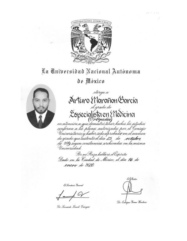 Soy el Dr. Arturo Marañón García, especialista en traumatología y ortopedia, egresado de Magdalena de las Salinas, uno de los hospitales más importantes en la formación de traumatología y ortopedia. Estoy certificado por el consejo mexicano de ortopedia y traumatología además de contar con experiencia en todas las áreas de la ortopedia. Con alta especialidad en Artroscopia y lesiones deportivas (Argentina). Mi formación me permite ayudar a mis pacientes en el diagnóstico y tratamiento de (hernia de disco, desgaste articular de rodilla y cadera, así como fracturas y lesiones deportivas), brindando atención de calidad y actualizada