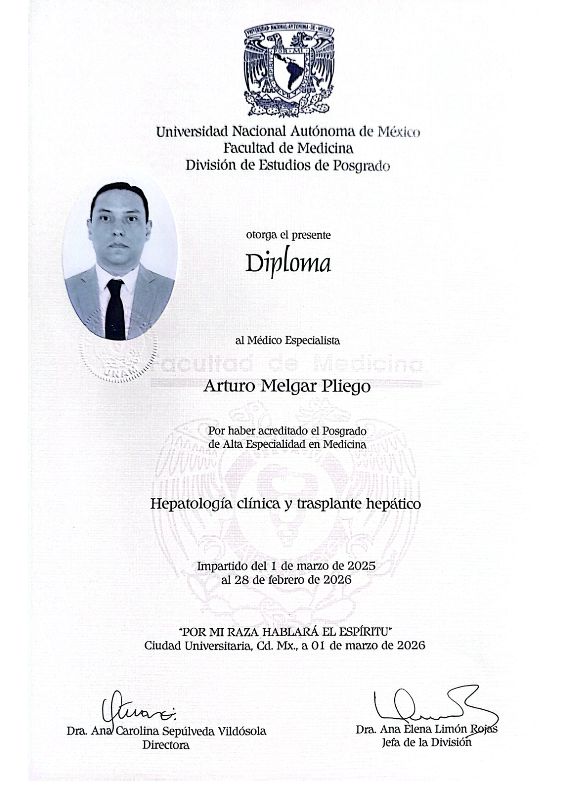 Dr. Arturo Melgar Pliego Alta Especialidad en Hepatología y Trasplante Hepático. en el Hospital General de México, Dr. Eduardo Liceaga. Especialidad en Medicina Interna. Centro Médico Militar de Guatemala. - Graduado con distinción Cum Lauden - Diploma a la Excelencia Académica por mejor residente 1er y 2do año, 2016. - Diploma a la Excelencia Académica por mejor residente 3er y 4to año, 2018. - Primer Jefe de Residentes de Medicina Interna Extranjero del CMM. - Presidente del Comité Organizador de la IX Semana Científica del CMM. - Premio a la Excelencia Académica y Mejor Residente 2018 por la Asociación de Medicina Interna de Guatemala Certificado por el Consejo de Medicina Interna de México 2023-2028 Miembro del Colegio de Medicina Interna de México Secretario Académico y Actual Presidente de la Filial Costa de Chiapas del Colegio de Medicina Interna 2025-2026 Miembro del Colegió de Medicina Interna de Guatemala Fellow of the American College Physicians, México Chapter. Chair of Communications Committee of the American College Physicians, México Chapter 2024-2028 Miembro Activo de la Asociacion Mexicana de Gastroenterologia, Miembro Activo del Asociacíon Mexicana de Hepatologia y AASLD. VIII International Course for Healthcare Leaders, University of Oxford. United Kingdom, 2023. Doctorado en Salud Publica y Gestión Sanitaria. IESCH, Campus Tapachula. -Titulado por Promedio -Mejor Promedio de la Generación 2020-2022 Maestría en Administración en Sistemas de Salud. IESCH, Campus Tapachula. - Titulado por Promedio. Licenciatura en Medicina General: IESCH, Campus Tapachula, - Graduado como Alma Mater y Alumno Excepcional - Fundador, Director y Columnista de la Gaceta Médica de la Universidad Campus Tapachula “Siglo XXI” - Ex-Becario IESCH - Presidente del comité de alumnos IESCH campus Tapachula. Servicio Social; 2006-2007. Jurisdicción Sanitaria No. VII, Tapachula, Chiapas. - Reconocimiento por el destacado desempeño realizado en el Servicio Social. - Reconocimiento por mejorar procesos administrativos y ampliación de la clínica durante el Servicio Social. - Presidente del Comité Organizador de la 2 das. Jornadas de Médicos y Enfermeros Pasantes del Servicio Social. Internado Medico: 2005-2006. Hospital General de Tapachula, Chiapas. - Primer Jefe de médicos Internos de Pregrado del IESCH en el Hospital General de Tapachula.