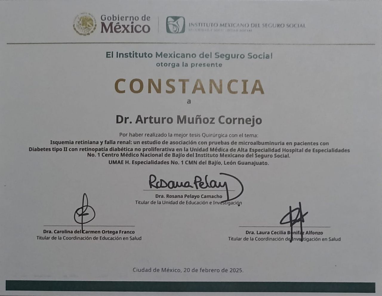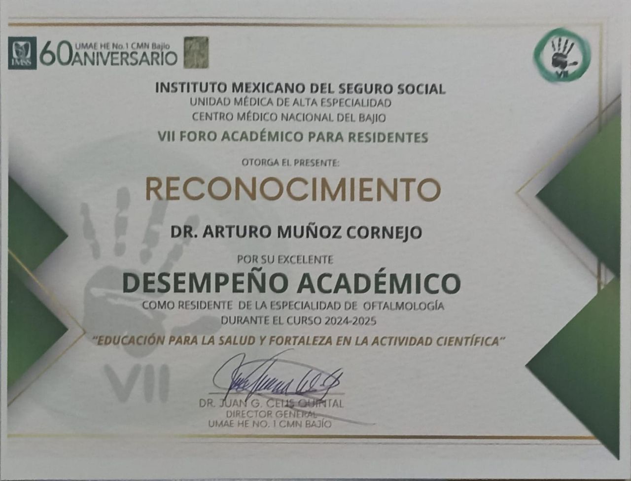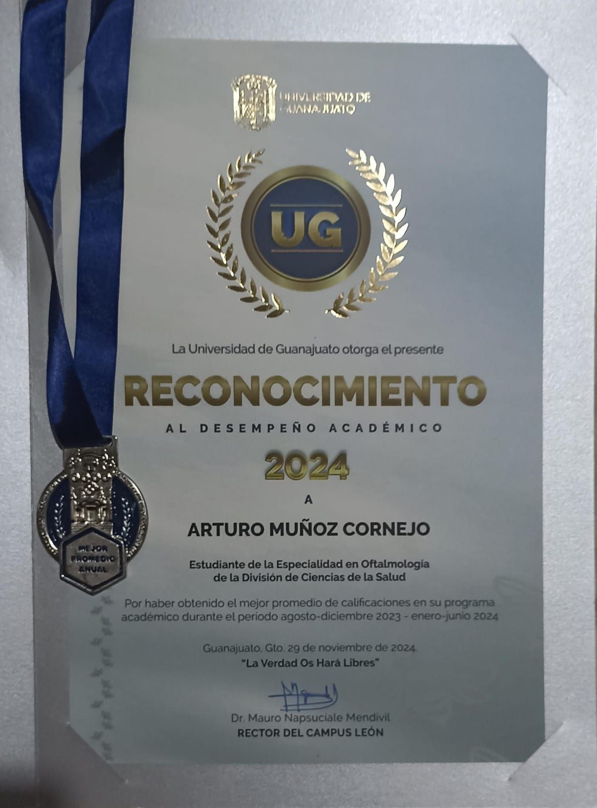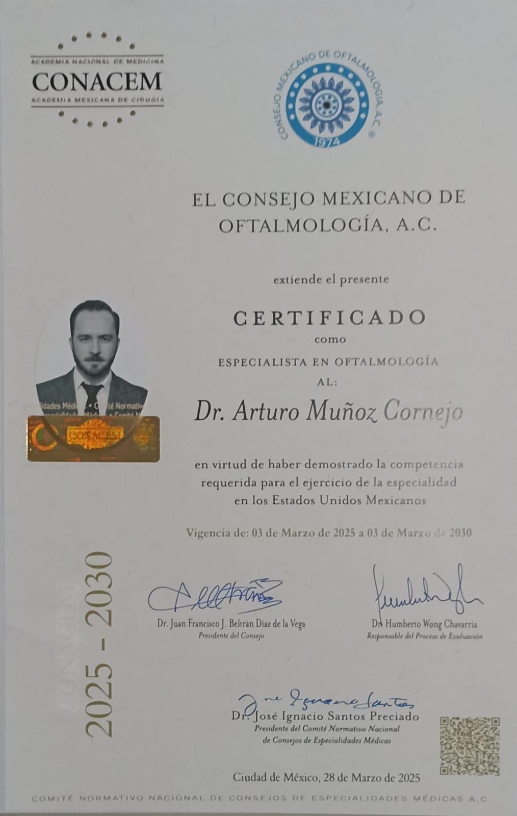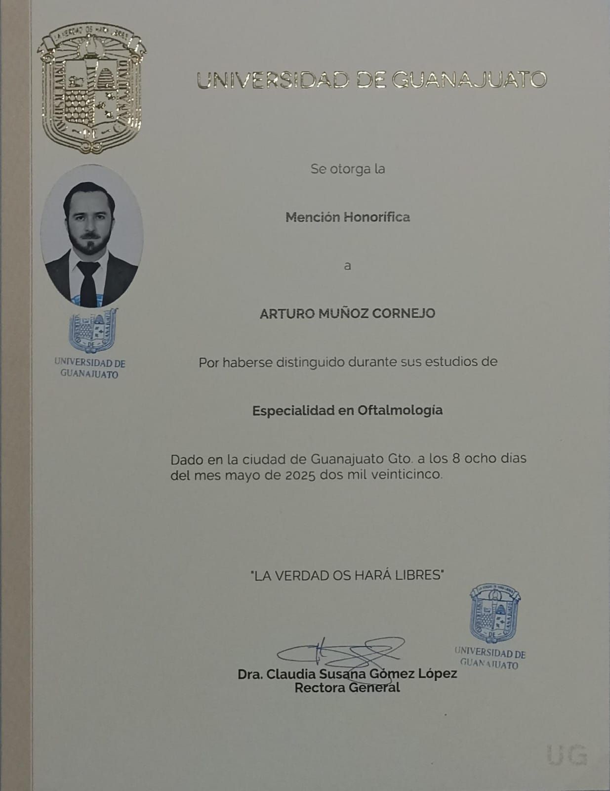 Cuento con formación como Médico Cirujano, Especialista en Oftalmología y Alta Especialidad en Retina y Vítreo. Obtuve primer lugar nacional en tesis quirúrgica, mención honorífica, mejor promedio de generación, y mi trabajo de investigación fue publicado como artículo científico en revista indexada. Estoy certificado por el Consejo Mexicano de Oftalmología y soy Miembro de la Sociedad Mexicana de Oftalmología.