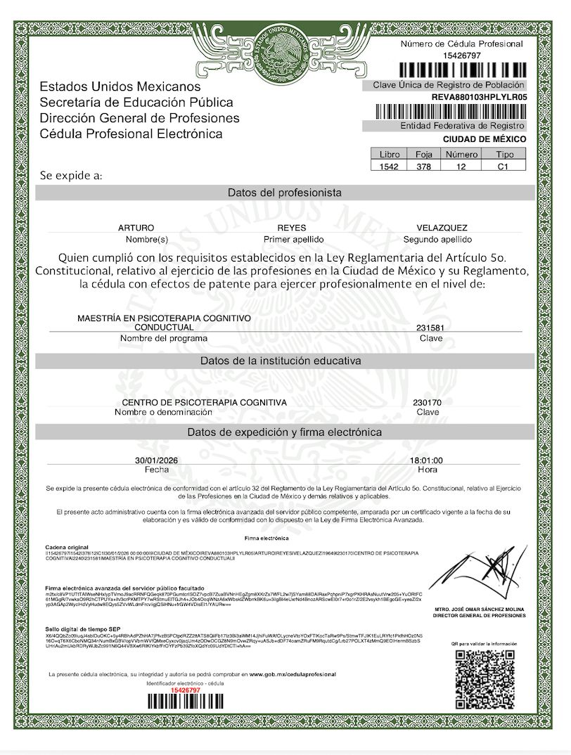 A fin de complementar mi práctica médica cursé la maestría en psicoterapia cognitivo conductual