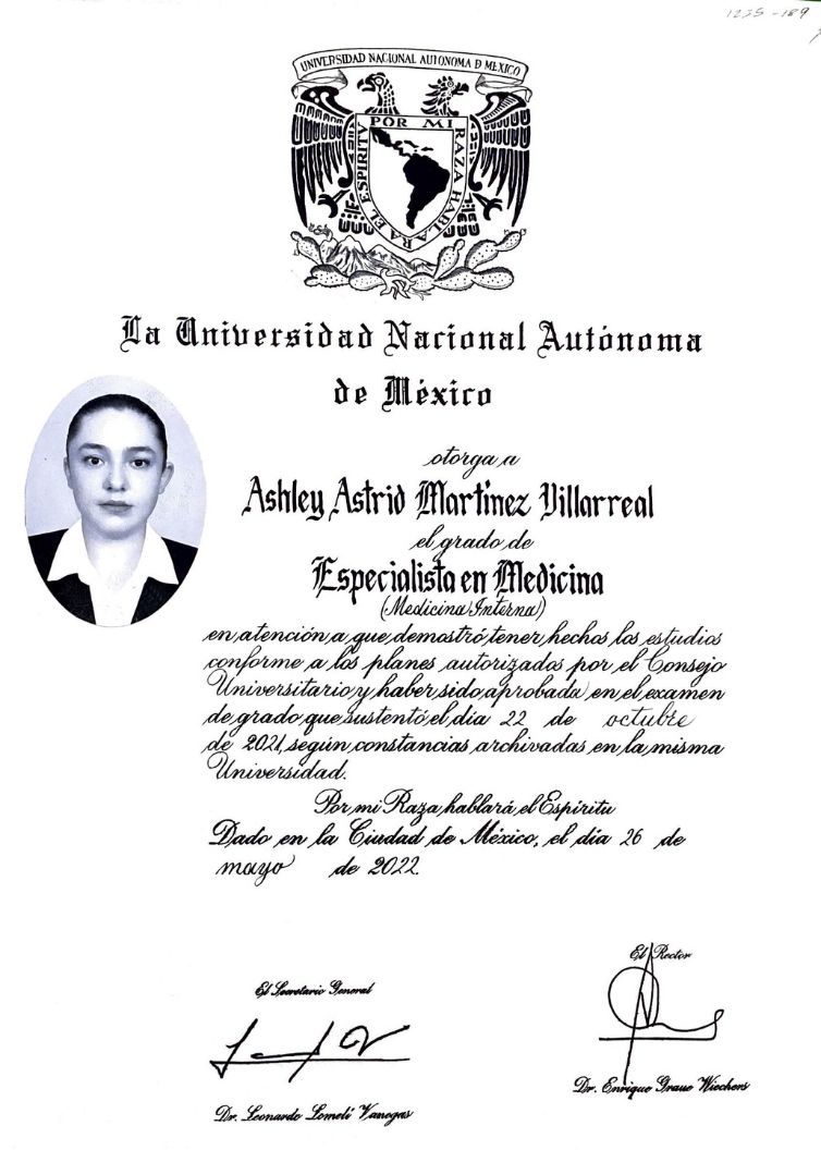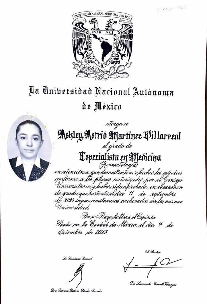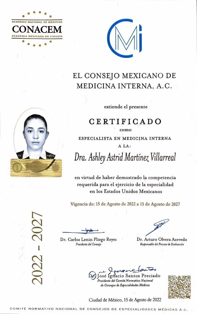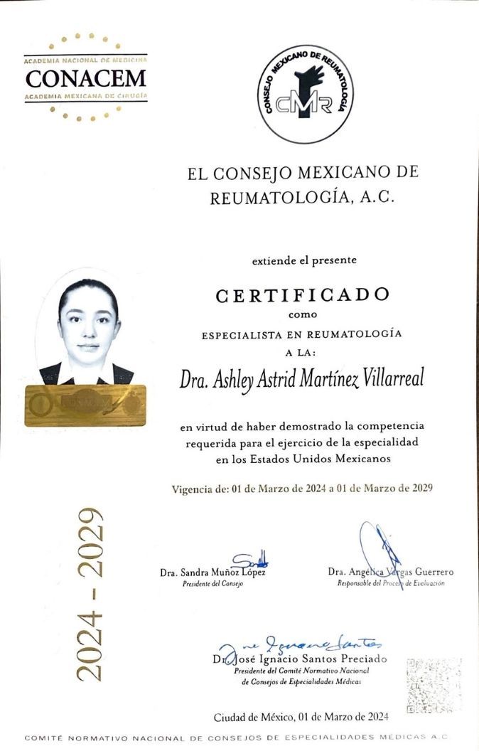 La Dra. Ashley Martínez cuenta con certificación por parte del Consejo Mexicano de Medicina Interna y el Consejo Mexicano de Reumatología, y es miembro activo del Colegio Mexicano de Reumatología.