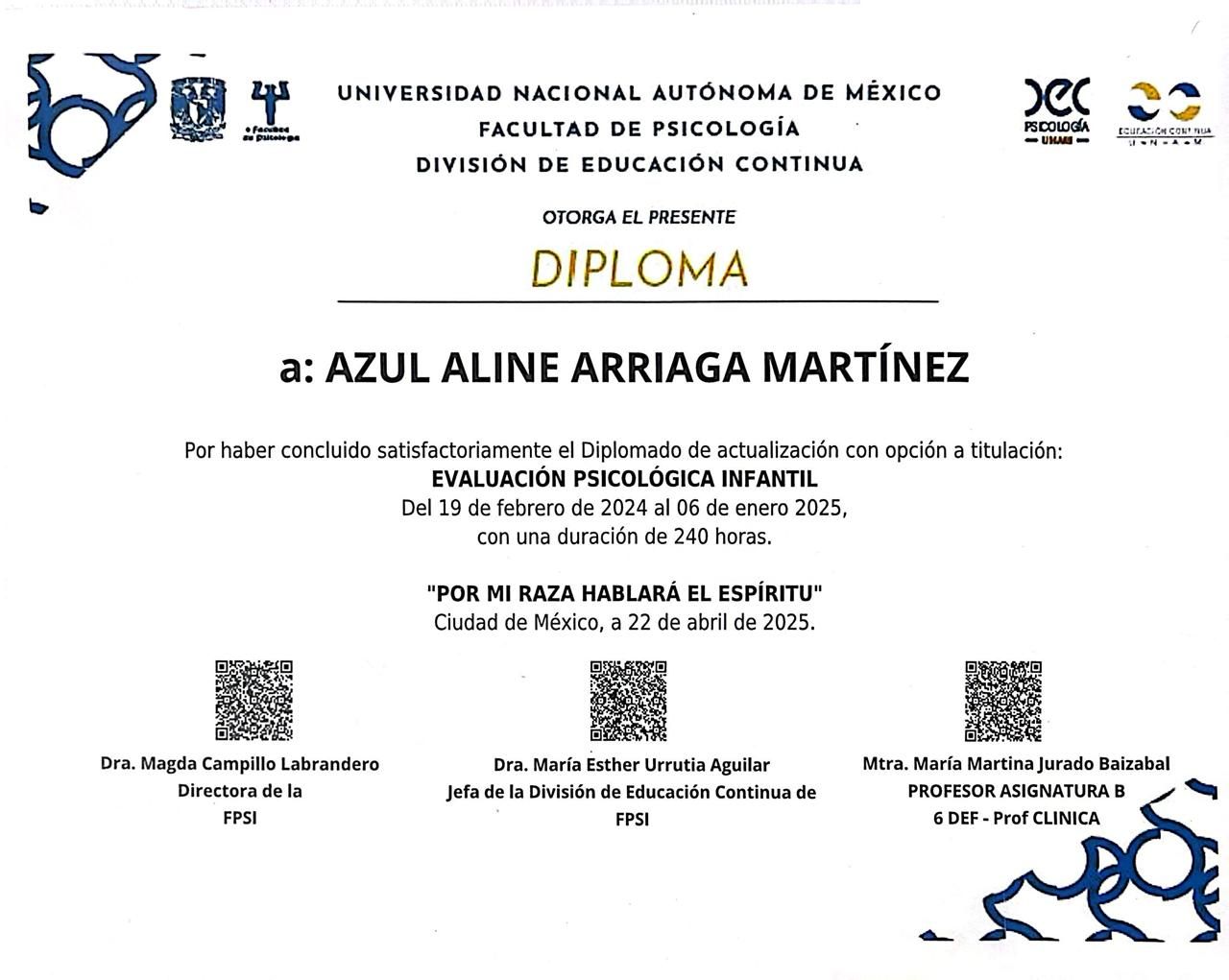 Cuento con un Diplomado en Evaluación Psicológica, que me permite aplicar herramientas profesionales y confiables para valorar el desarrollo emocional, conductual y cognitivo, adaptando la intervención a las necesidades específicas de cada persona.
