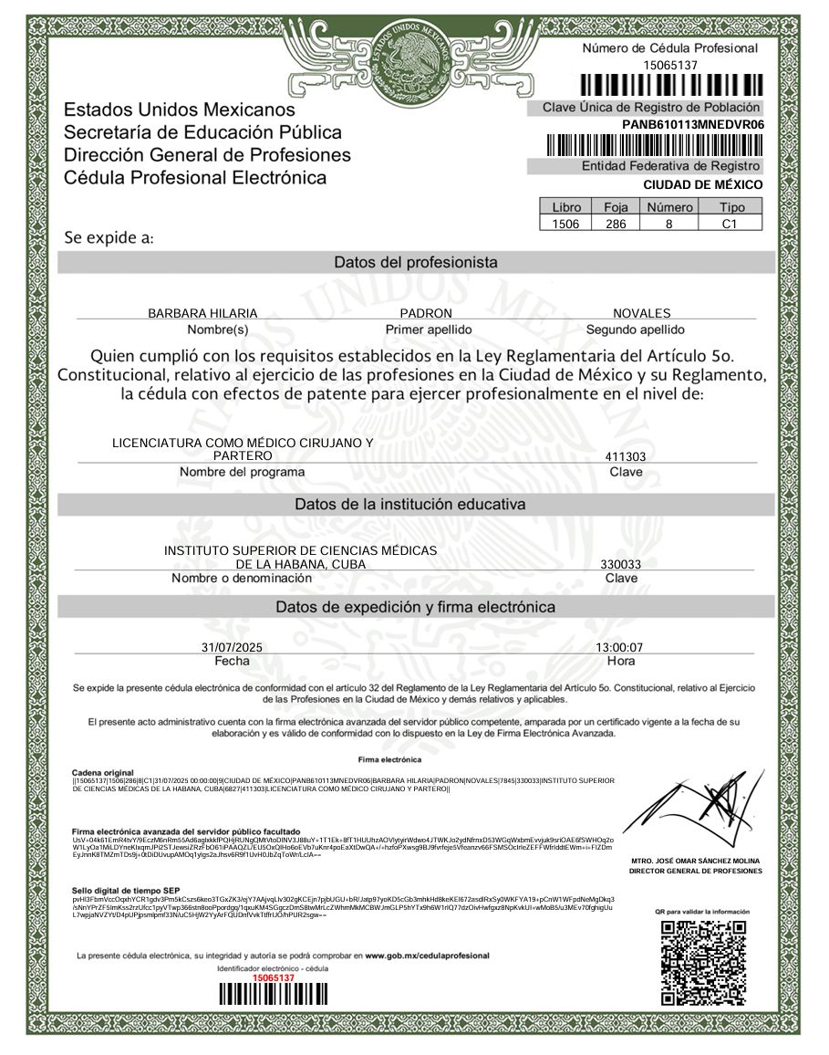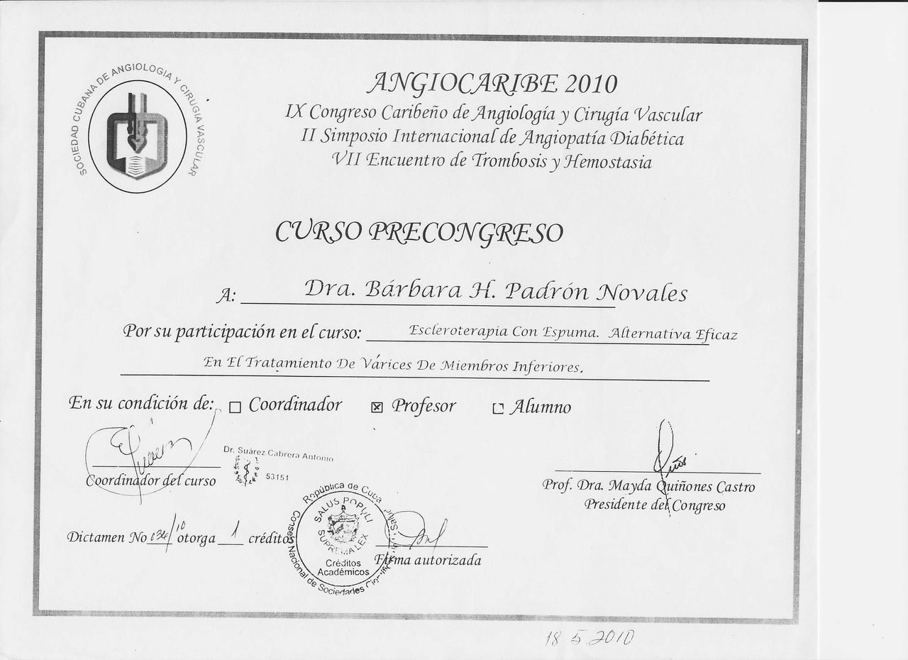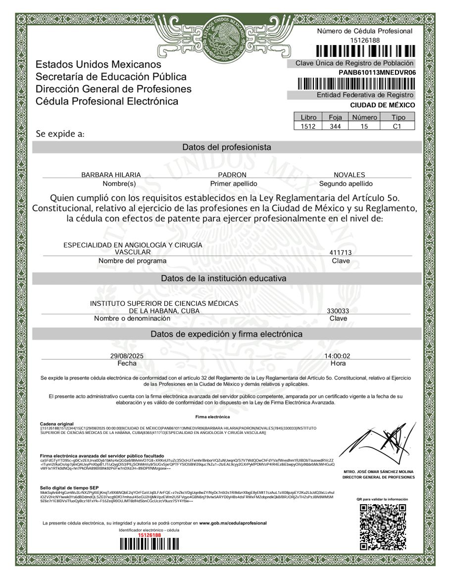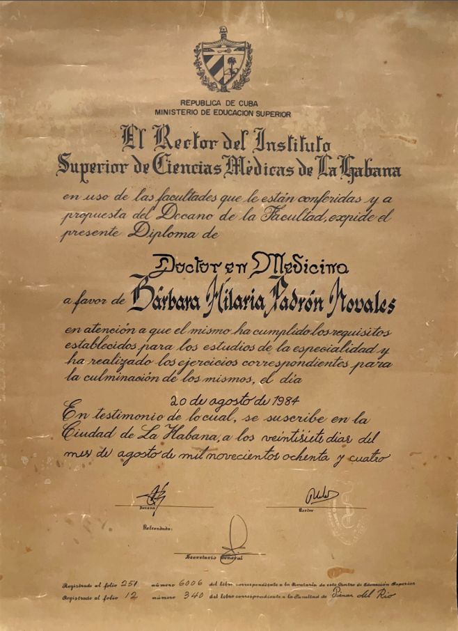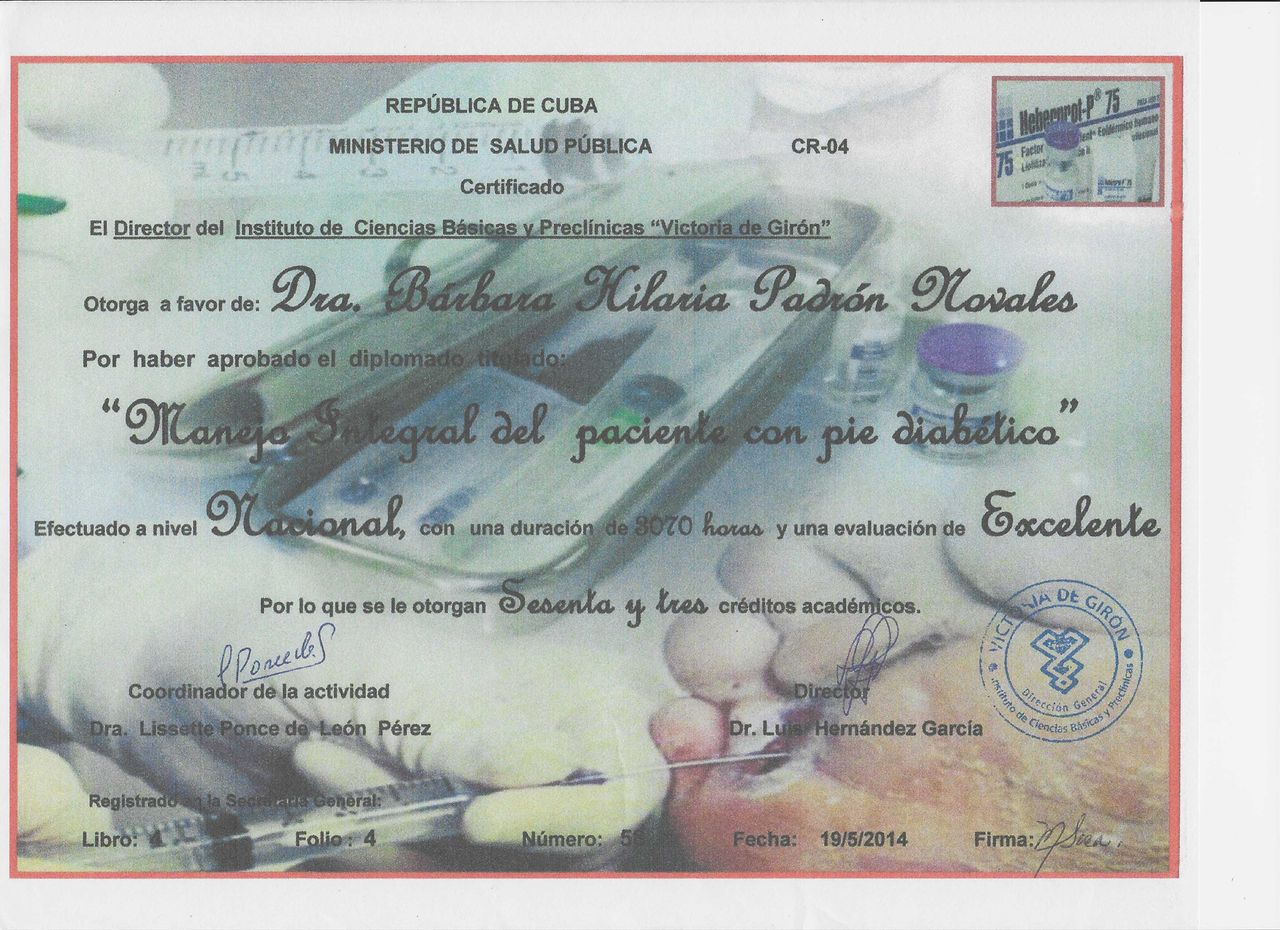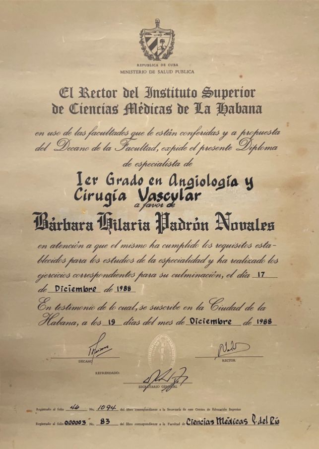 Titulada en Medicina en la Universidad de Ciencias Médicas de La Habana, con especialización en Angiología y Cirugía Vascular, con 40 años de experiencia al servicio de los más necesitados, dedicada al diagnóstico, tratamiento y prevención de enfermedades del sistema vascular y en el tratamiento del pie diabético. Con experiencia en la impartición de docencia con más de 30 años frente a aulas y en la formación de jóvenes doctores. Máster en Informática aplicada a la salud y Máster en enfermedades cerebrovasculares.