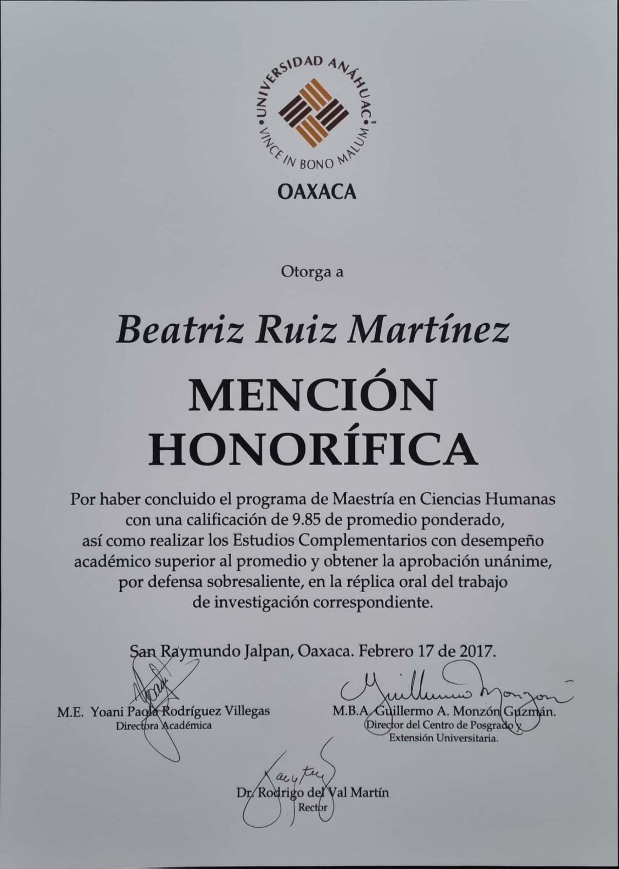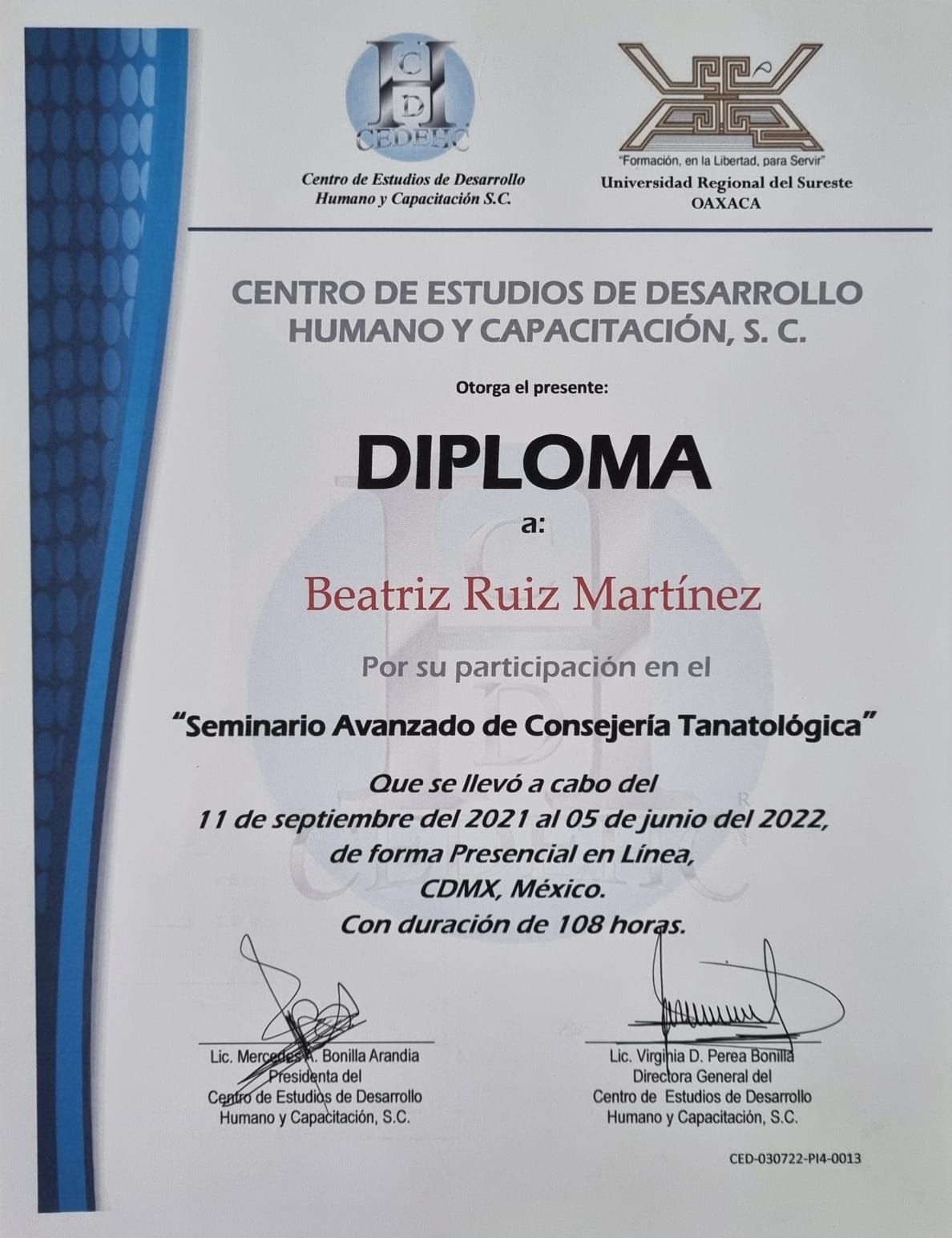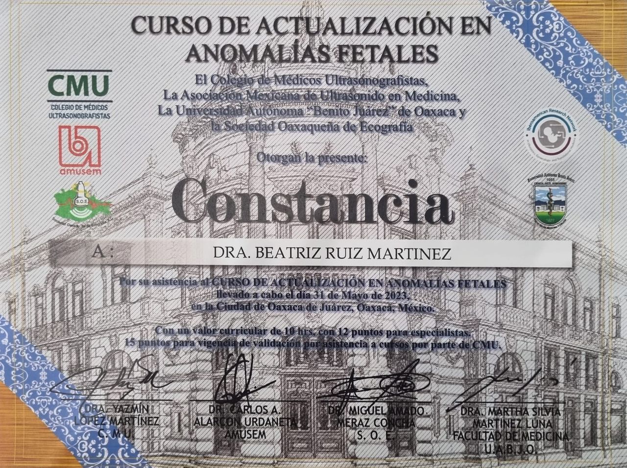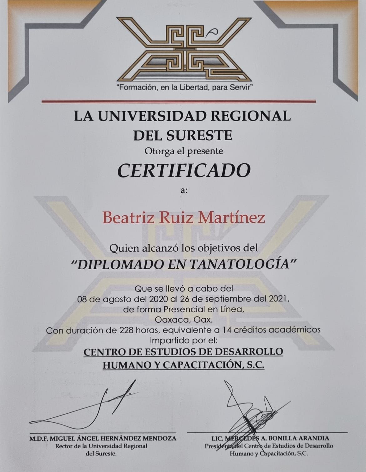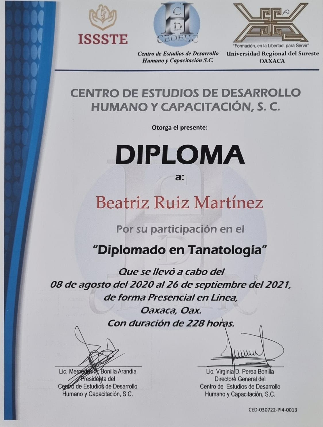 Realicé la Maestría en Ciencias Humanas en la que obtuve Mención Honorífica por defensa sobresaliente de mi investigación titulada Formación ética de los estudiantes de Medicina en Oaxaca, la cual fue publicada en la revista de gran prestigio REENCUENTRO de la Universidad Autónoma Metropolitana. Posteriormente realicé el Diplomado y Seminario avanzado en acompañamiento tanatológico con el objetivo de saber informar, contener, comprender, acompañar y atender de la mejor manera posible a aquellos pacientes con diagnósticos inesperados. También he acompañado a personas con otros tipos de duelo como muerte de un ser querido, abortos, rupturas de pareja, pérdida de trabajo, cambio de residencia etc.