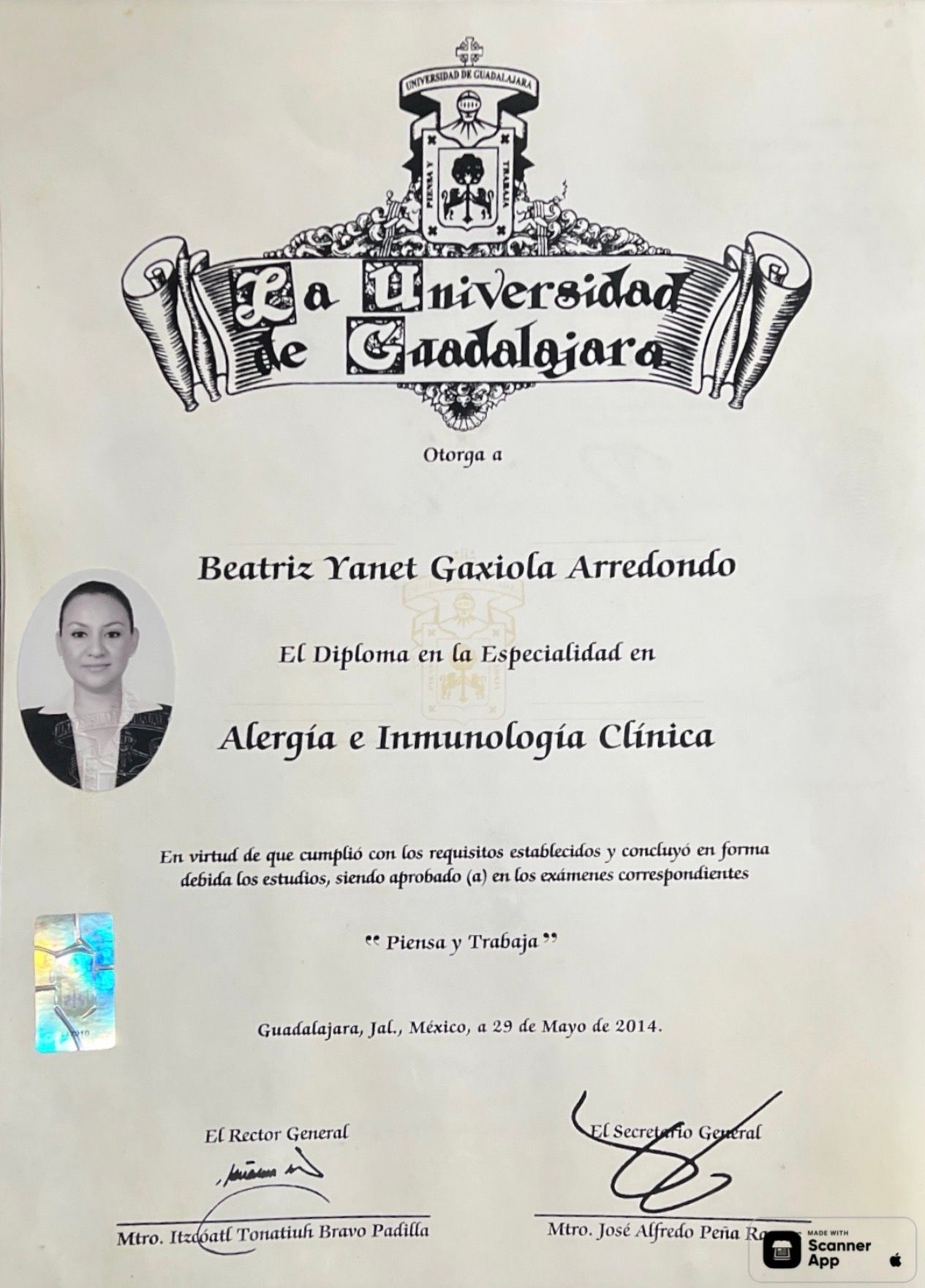 Posteriormente realicé la Subespecialidad en Alergia e Inmunología Clínica por la Universidad de Guadalajara, en los Hospitales Civiles de Guadalajara.