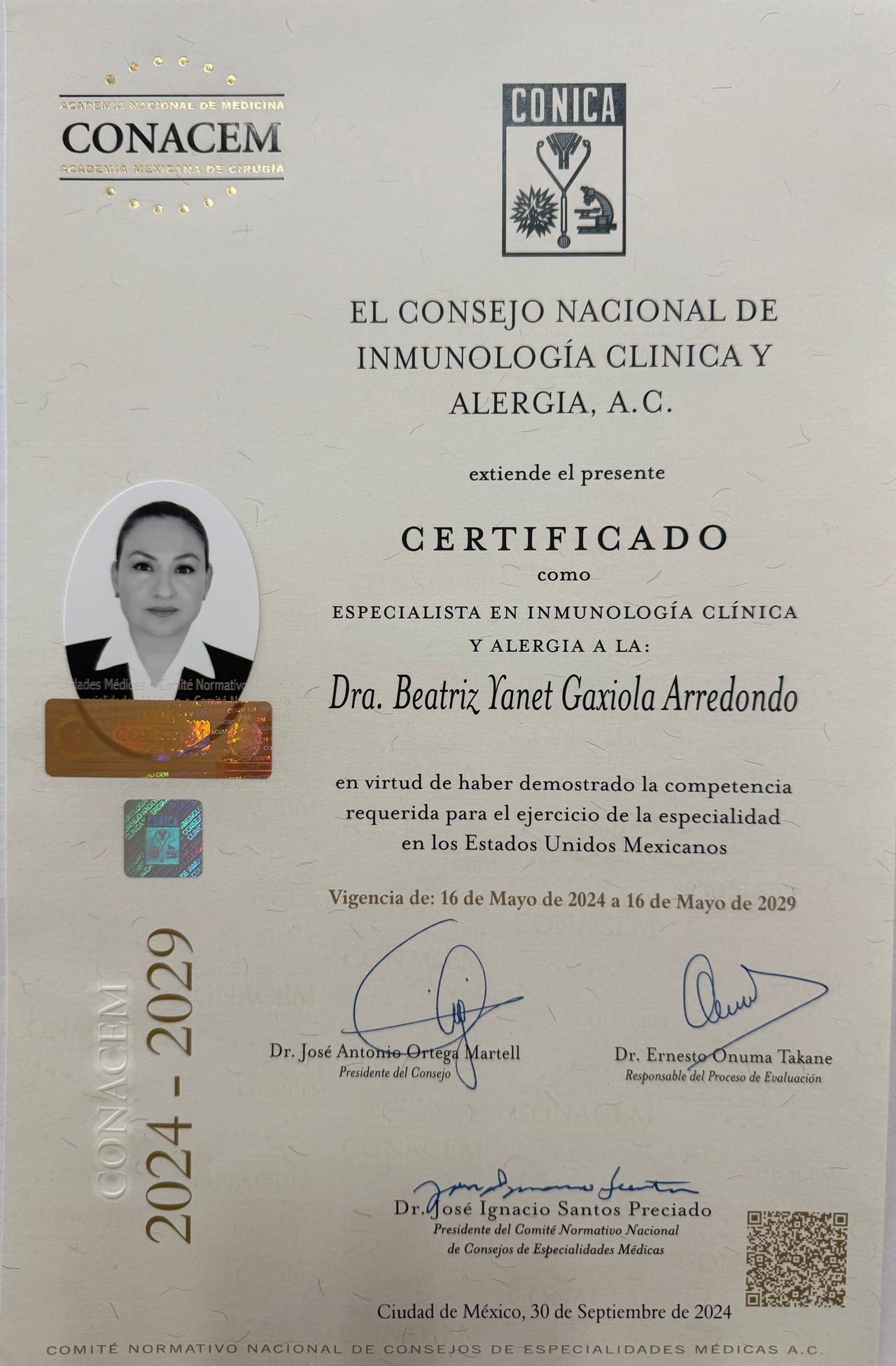 Estoy certificada por el Colegio Nacional de Inmunología Clínica y Alergia, lo que me permite ofrecer atención actualizada y segura para cada paciente.