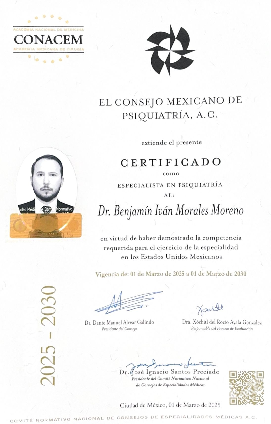 ¡Hola! Soy el Dr. Iván Morales, médico especialista en psiquiatría. Cursé la licenciatura en Medicina en la Universidad Autónoma de Baja California (UABC) en la ciudad de Tijuana, Baja California, obteniendo mi título en el año 2018. Posteriormente, realicé mi especialidad en Psiquiatría en el Hospital de Especialidades del Centro Médico Nacional Siglo XXI del IMSS, en la Ciudad de México, un prestigioso hospital con reconocimiento y aval de la Universidad Nacional Autónoma de México (UNAM), donde culminé mi formación en febrero de 2025.