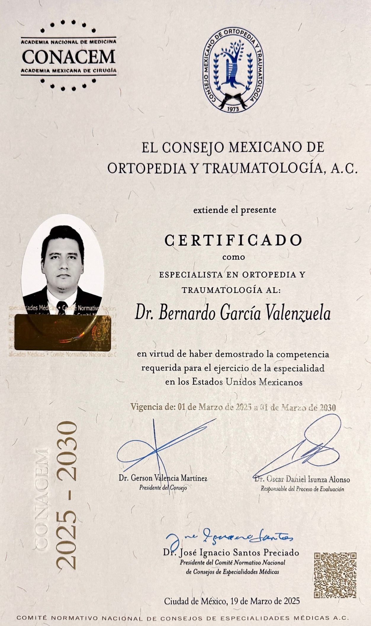 Hola! Soy el Dr. Bernardo García, Ortopedista Traumatólogo, enfocándome en padecimientos musculoesqueléticos, tendinopatías así como padecimientos articulares.