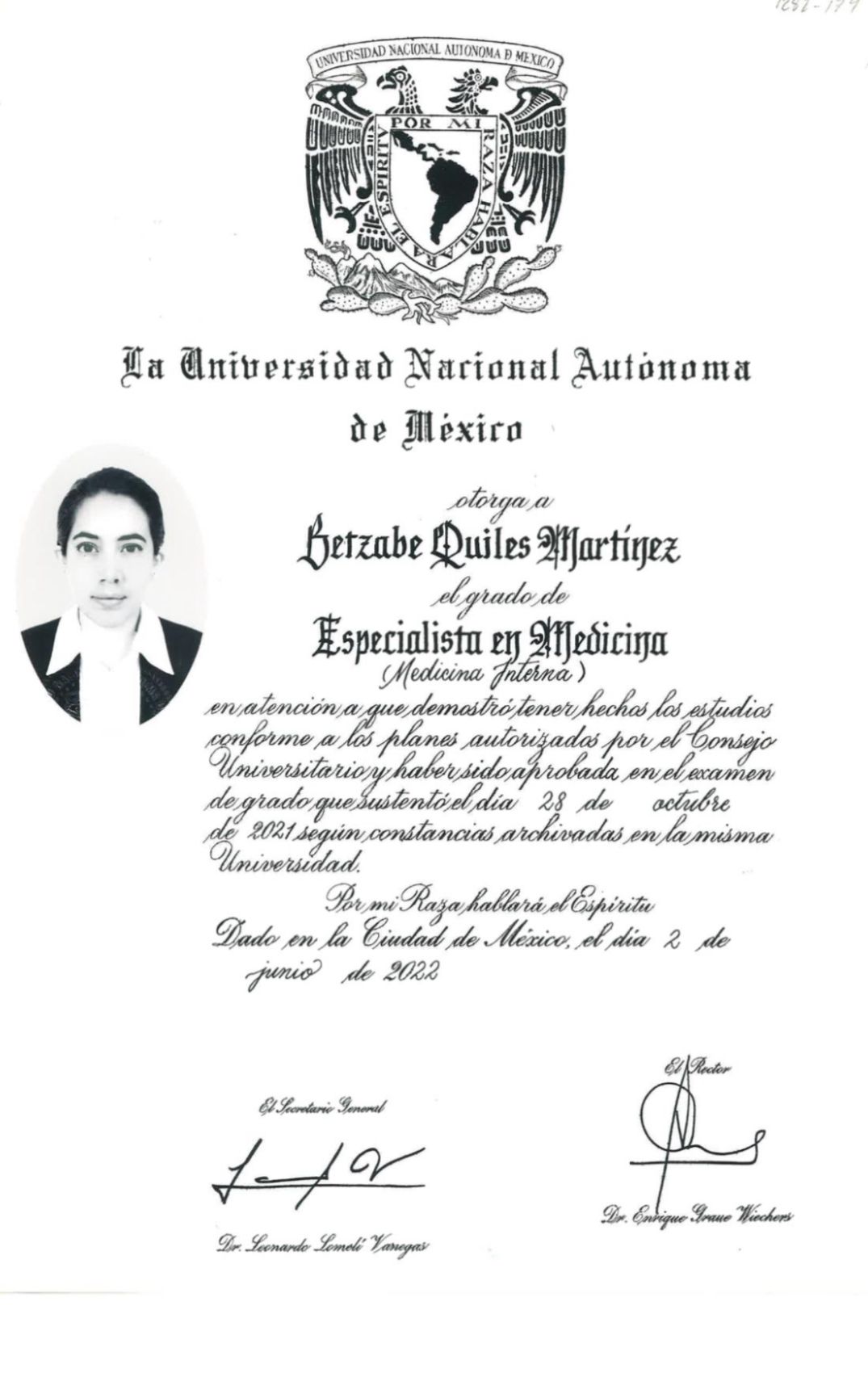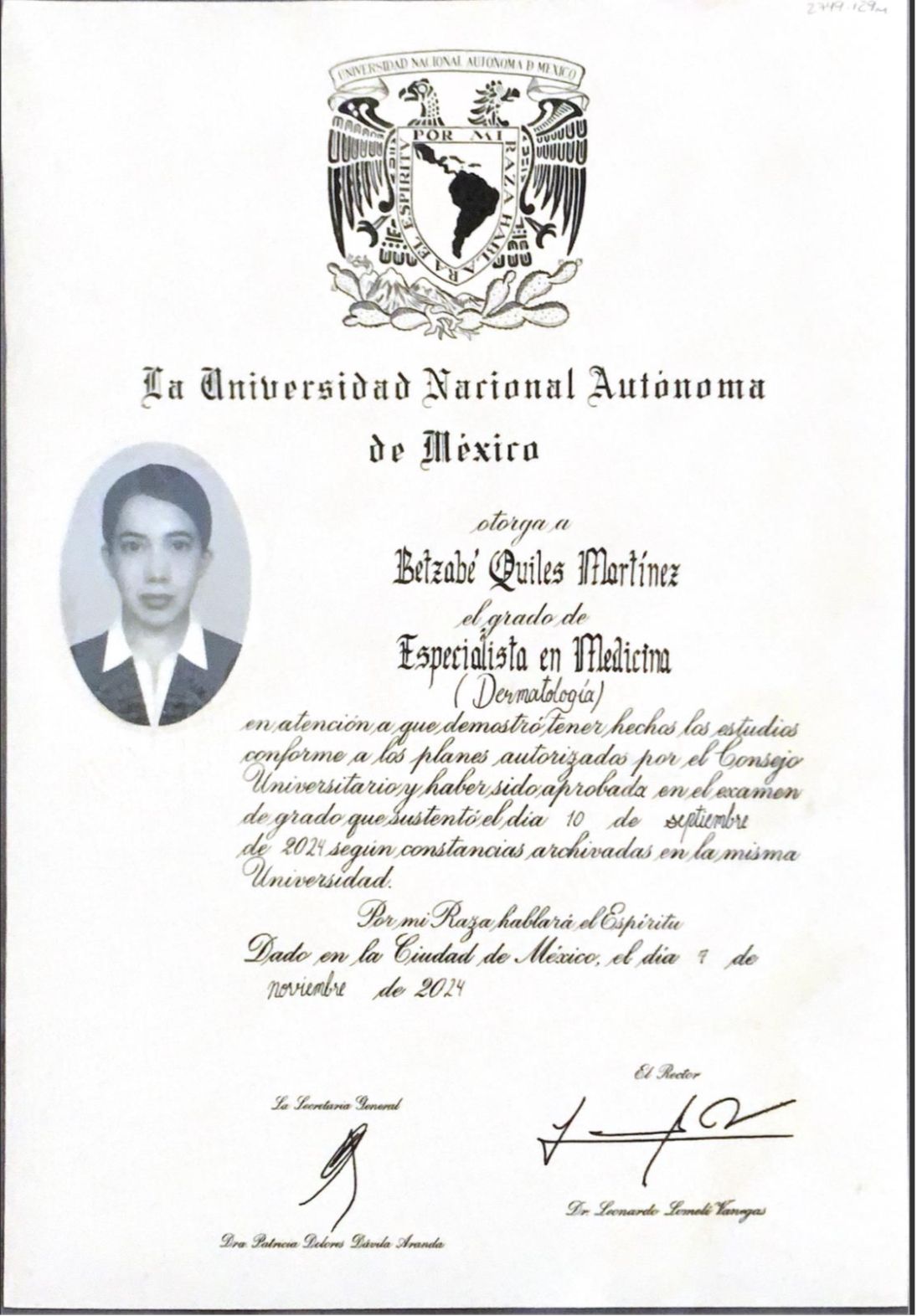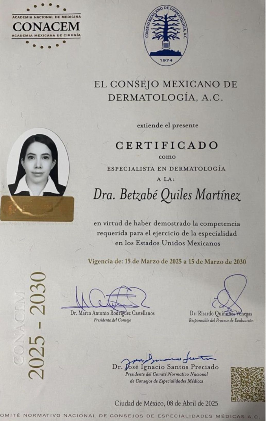 Dermatóloga certificada, formada en el Instituto Nacional de Ciencias Médicas y Nutrición “Salvador Zubirán” y cirujana dermato-oncóloga por el Hospital Gea Gonzalez.