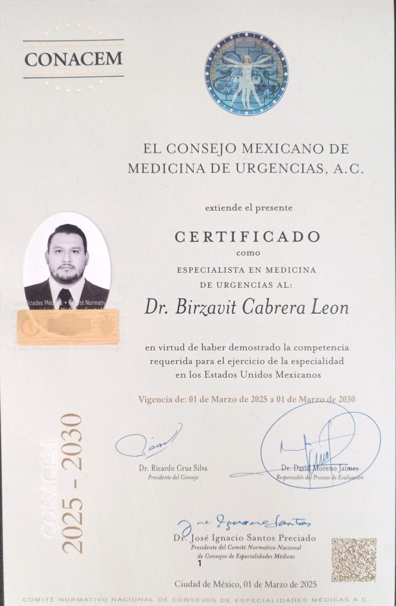 Certificado por el consejo Mexicano de Urgencias No 7735/CU/25