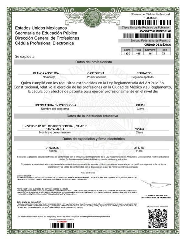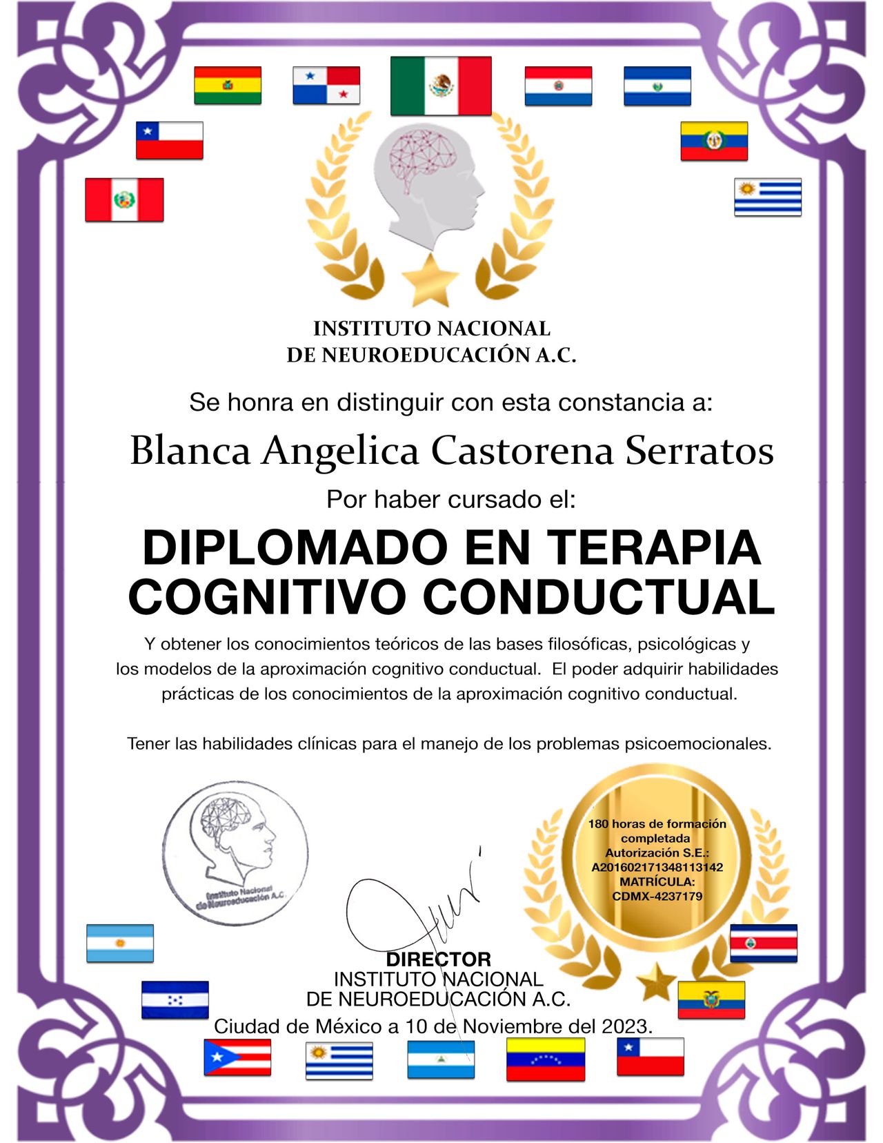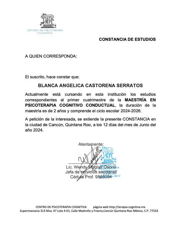 Hola, soy la Lic. Angélica Castorena, psicóloga clínica con enfoque en terapia cognitivo conductual. Actualmente curso una maestría en Psicoterapia Cognitivo Conductual por el Centro de Psicoterapia Cognitiva y cuento con diplomados en TCC para adolescentes, terapia de pareja y terapia individual.