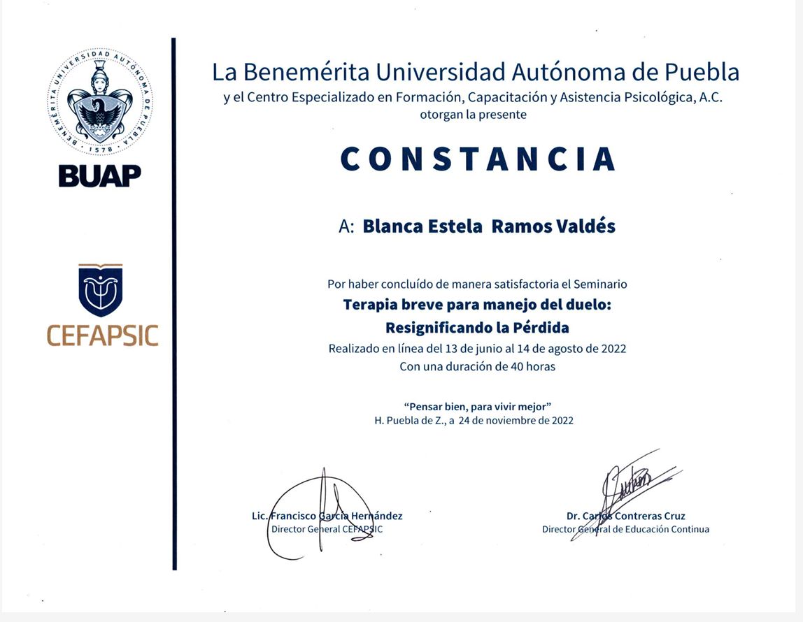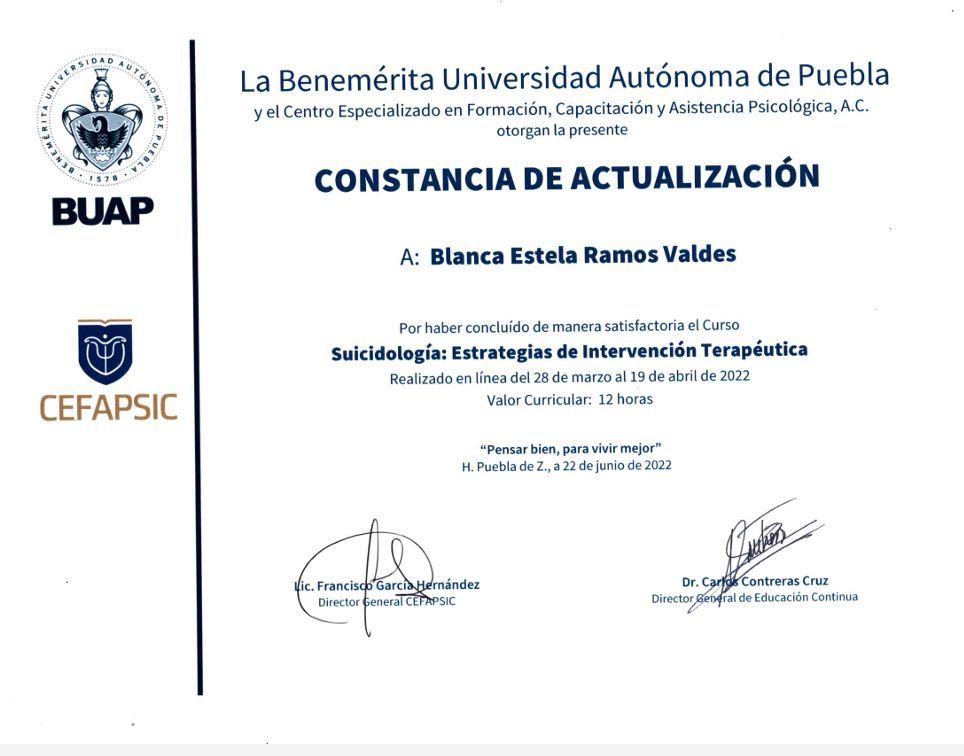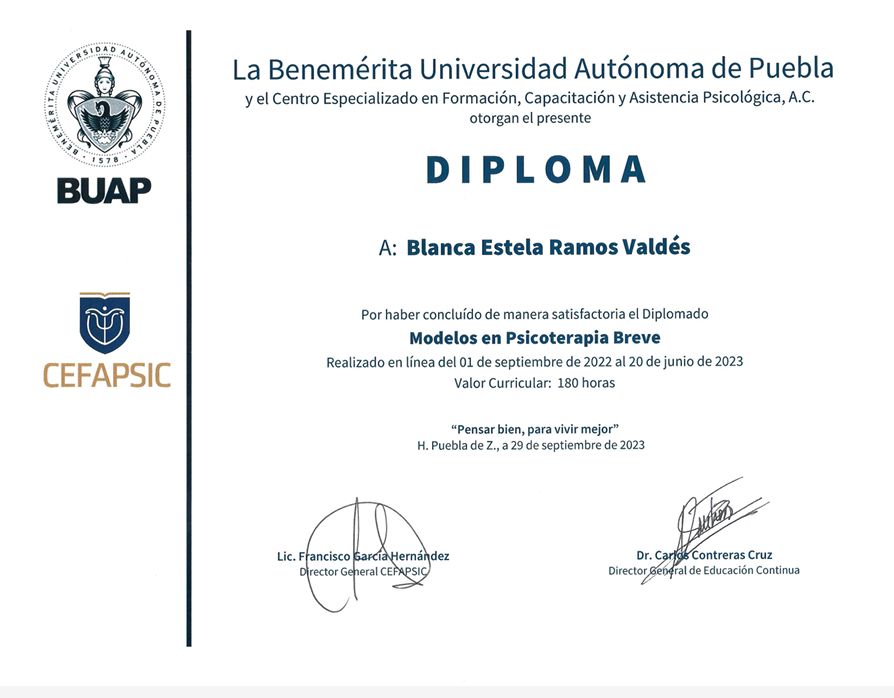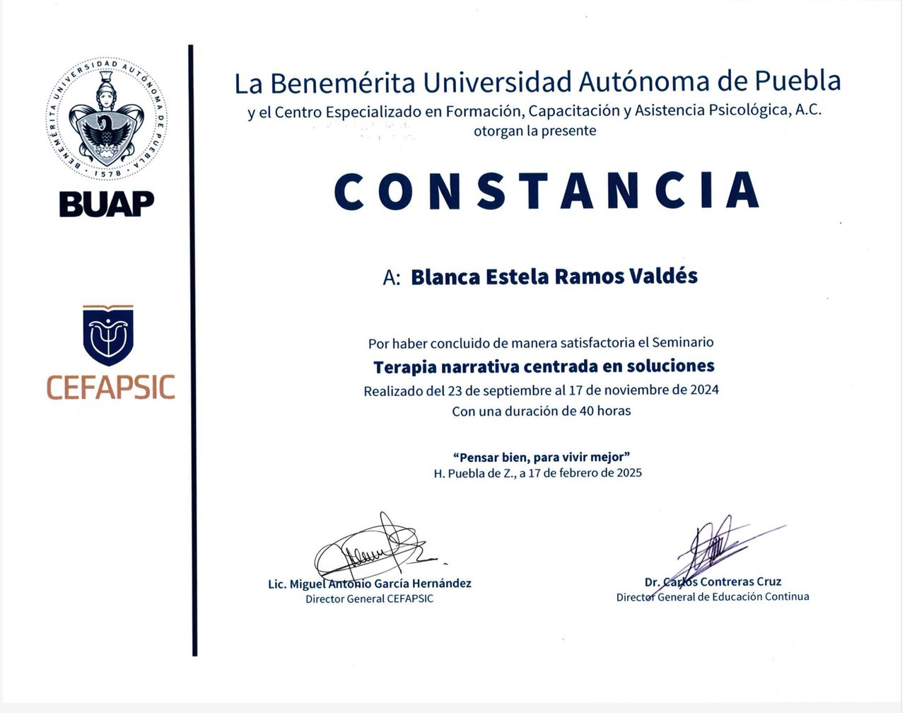 Me he formado con diversos diplomados y seminarios en psicoterapia infantil, modelos de intervención en terapia breve, abordaje de ansiedad y depresión, duelo y actualmente me encuentro en formación en el modelo de Terapia de Aceptación y Compromiso (ACT), reforzando así mi compromiso con una práctica basada en evidencia científica.