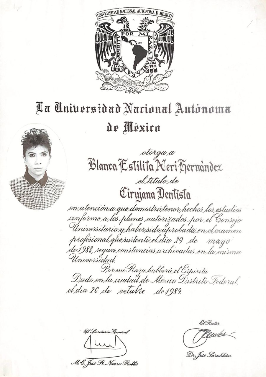 Soy la Dra. Blanca Neri, egresada de la licenciatura de la UNAM y la especialidad en el C.E.I.O, con una trayectoria profesional de 39 años y 25 años en el Corporativo Hospital Satélite, coordinando al grupo de especialidades odontológicas.