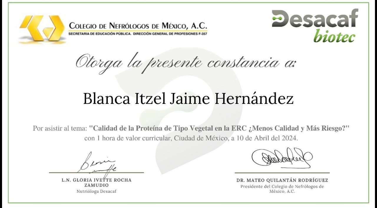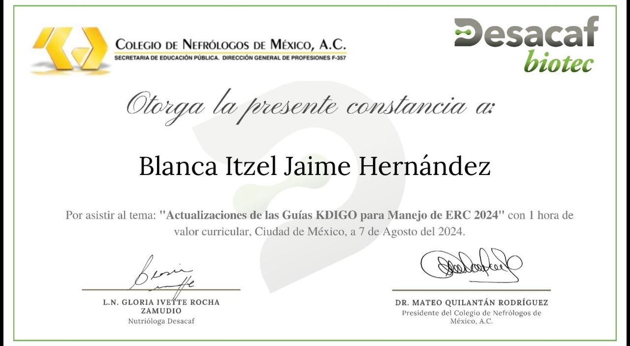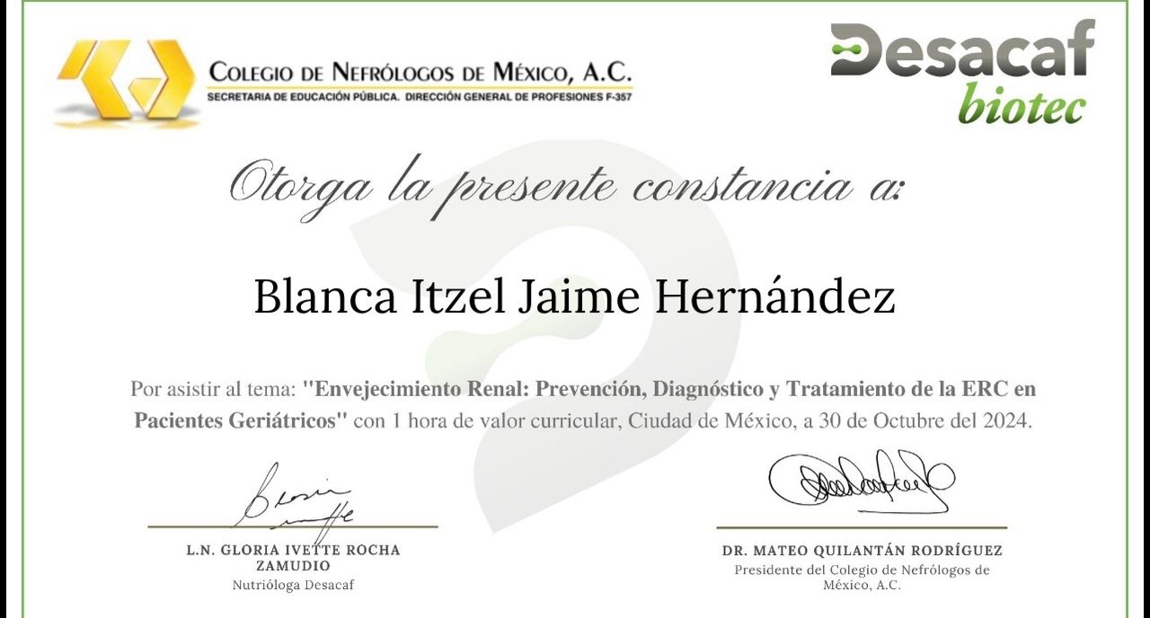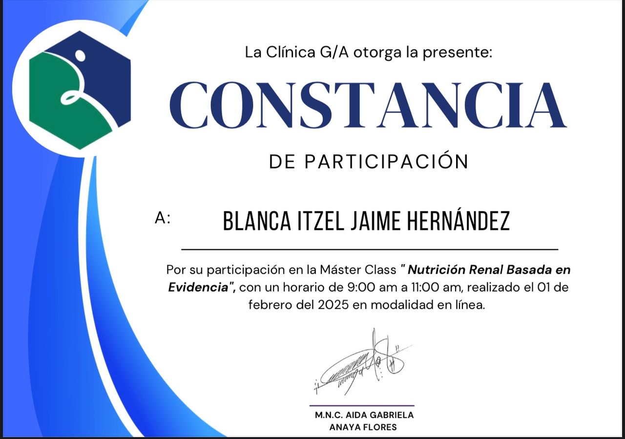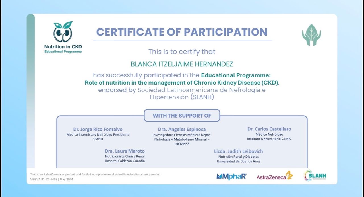 Mi nombre es Itzel Jaime y soy una nutrióloga enfocada en la atención nutricional de pacientes con enfermedades crónicas, como Enfermedad Renal Crónica, Diabetes Mellitus e Hipertensión arterial, tengo un historial de experiencia en el sector clínico, en instituciones públicas y privadas.