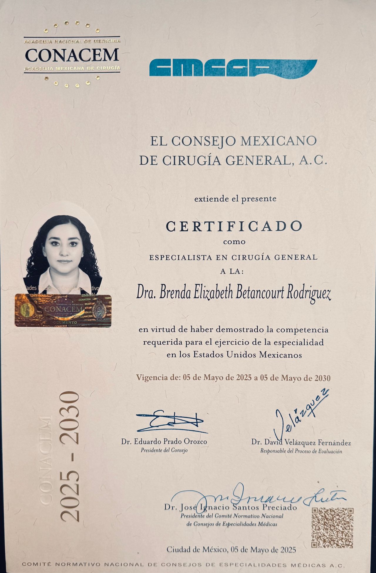 Estoy certificada por el Consejo Mexicano de Cirugía General y soy miembro de AMCG, AMCE y AMH.