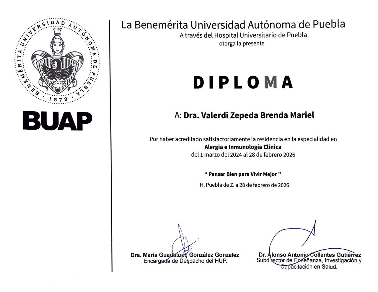 Mi último grado de estudios es en Alergia e Inmunología Clínica, con el objetivo de brindar atención especializada tanto a niños como a adultos con enfermedades alérgicas e inmunológicas.