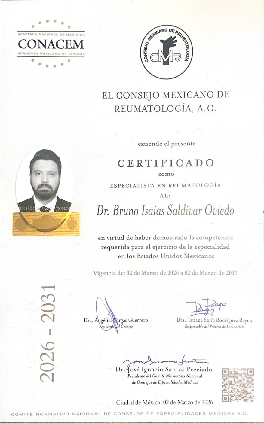 Soy el Dr. Bruno Isaías Saldivar Oviedo Médico Reumatólogo e internista.