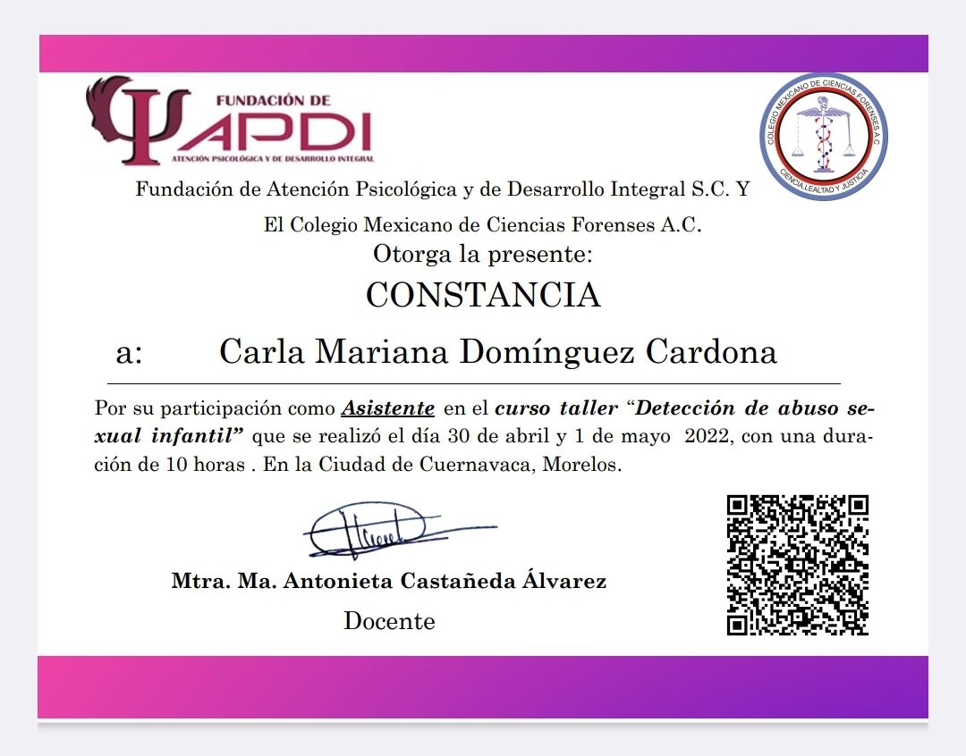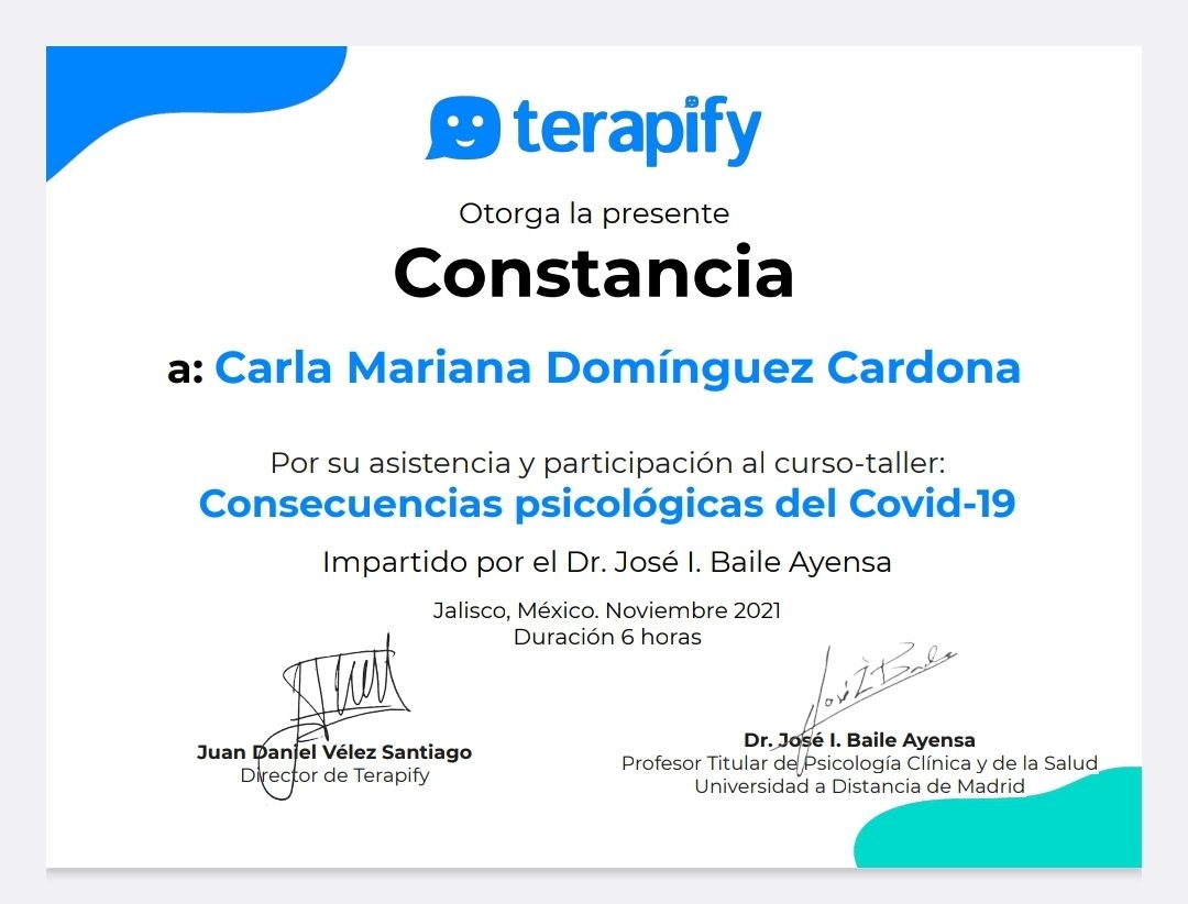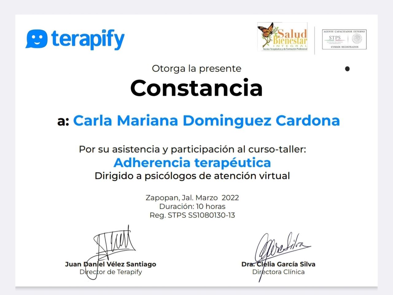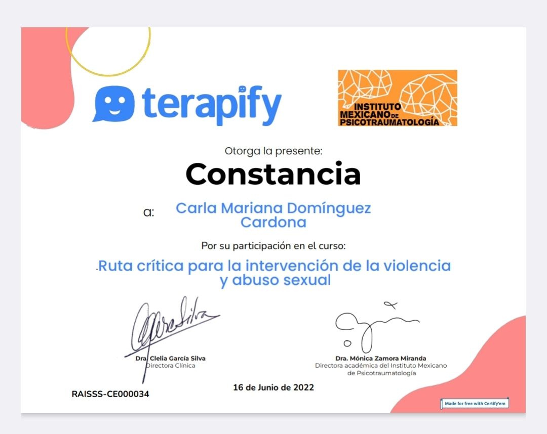 Recomiendo mucho tomar terapia con Carla, muy profesional, puntual y gran apoyo. Se que si algún día necesito terapia de nuevo puedo contar con ella :D